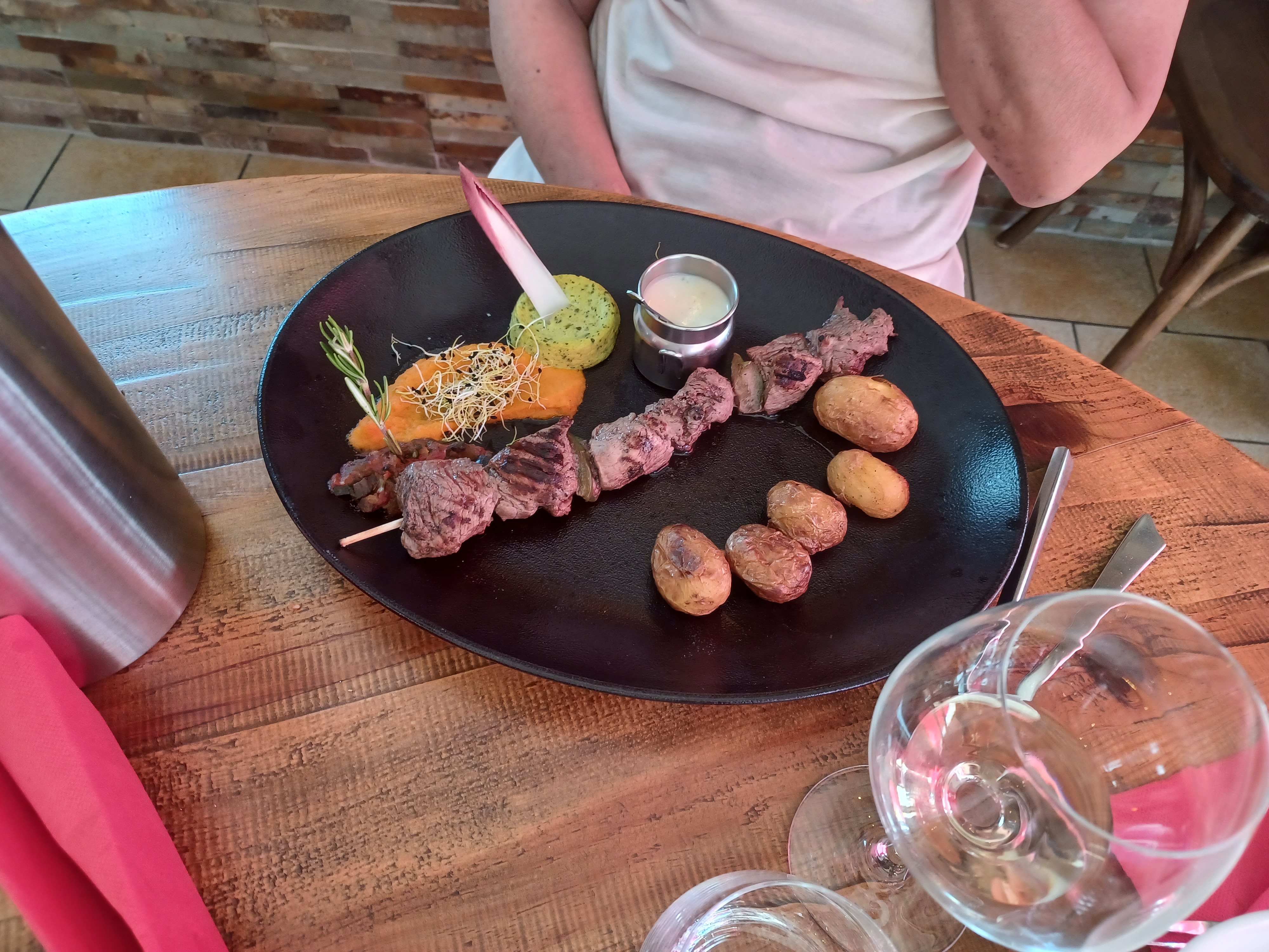 Entrée : croustillant pas assez cuit Plat : brochettes de viande filandreuse et accompagnement arrivé froid Service aléatoire... A éviter