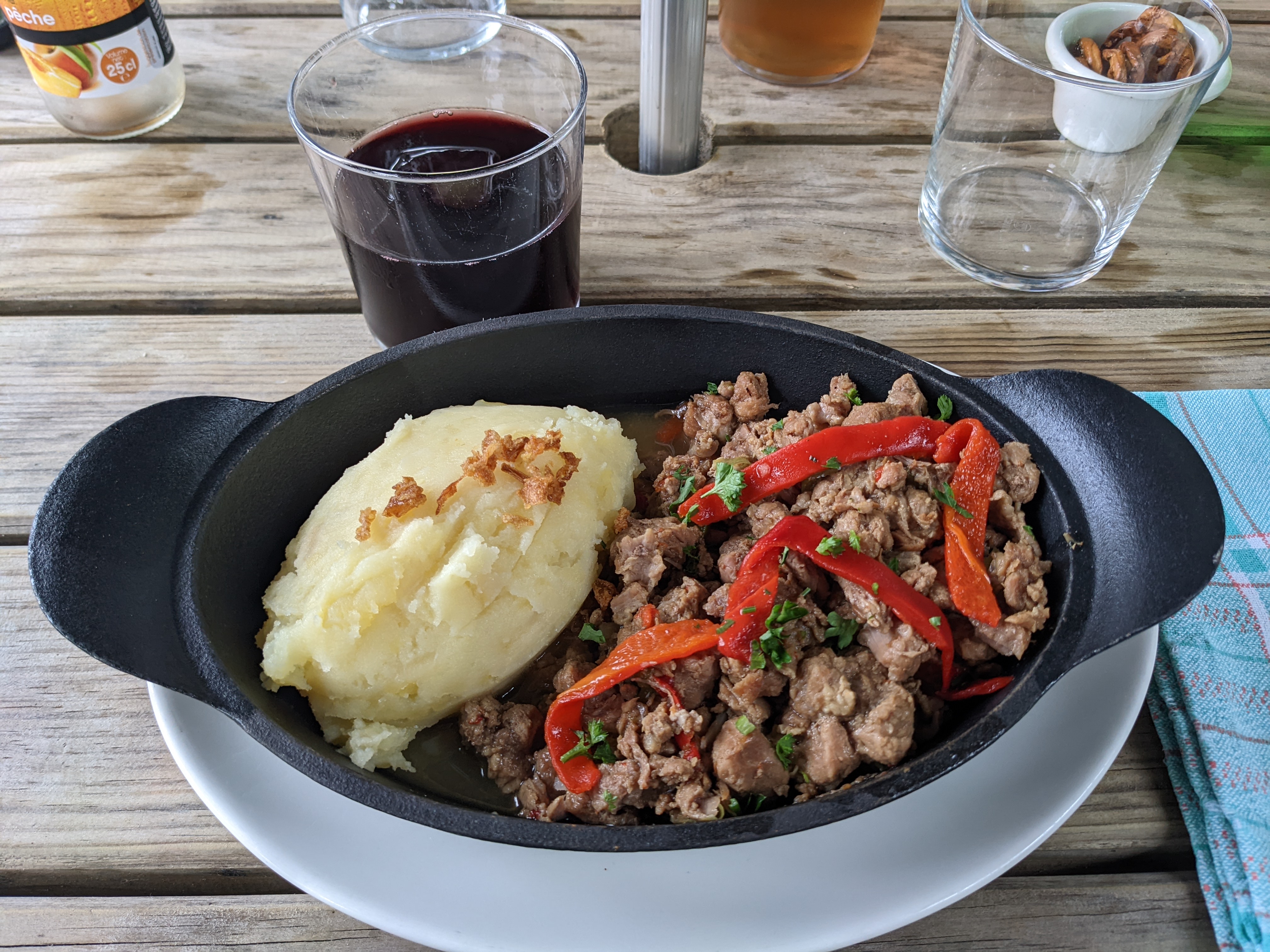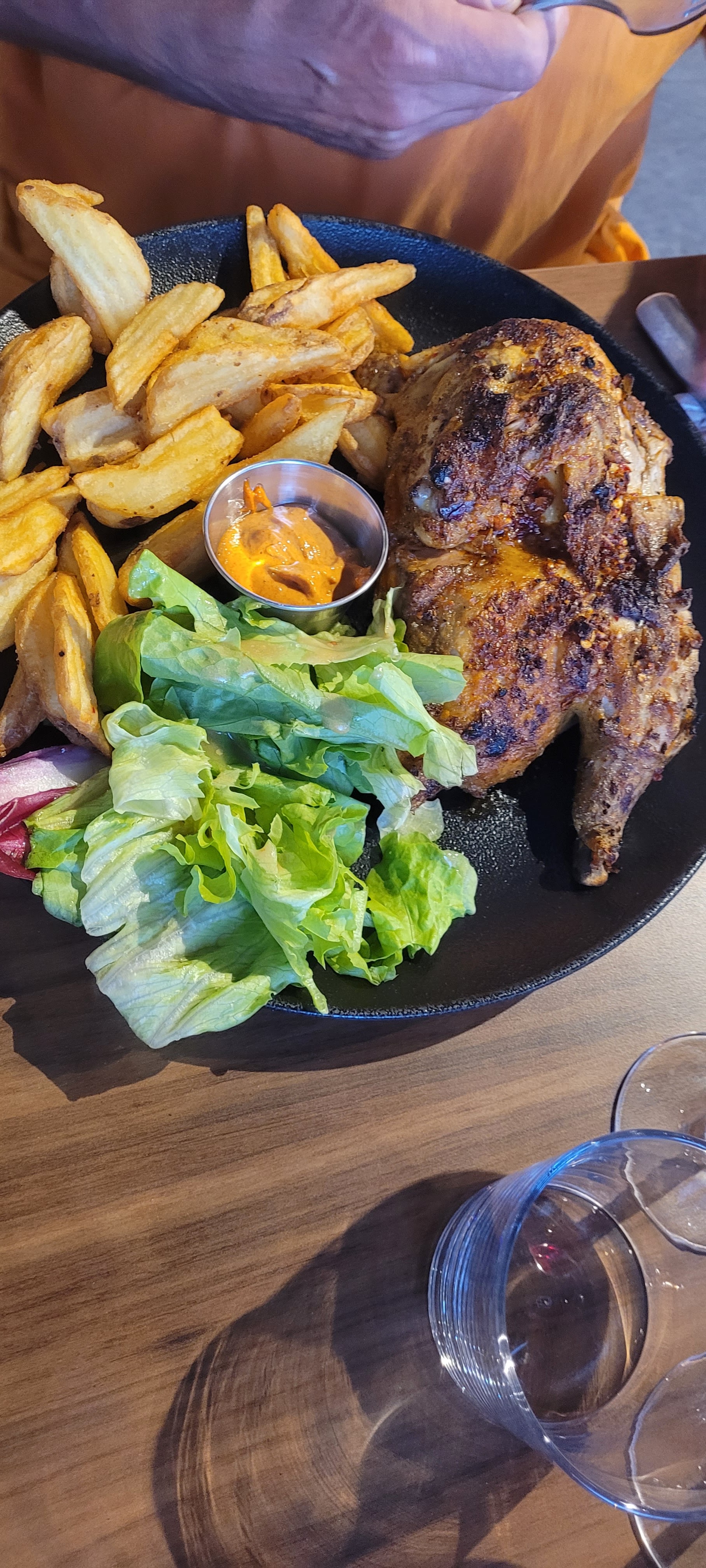 Terrasse ombragée très agréable. Service rapide et chaleureux. Vin et plats excellents.Le Poulet était savoureux ainsi que le porc cuit au feu de bois.je recommande