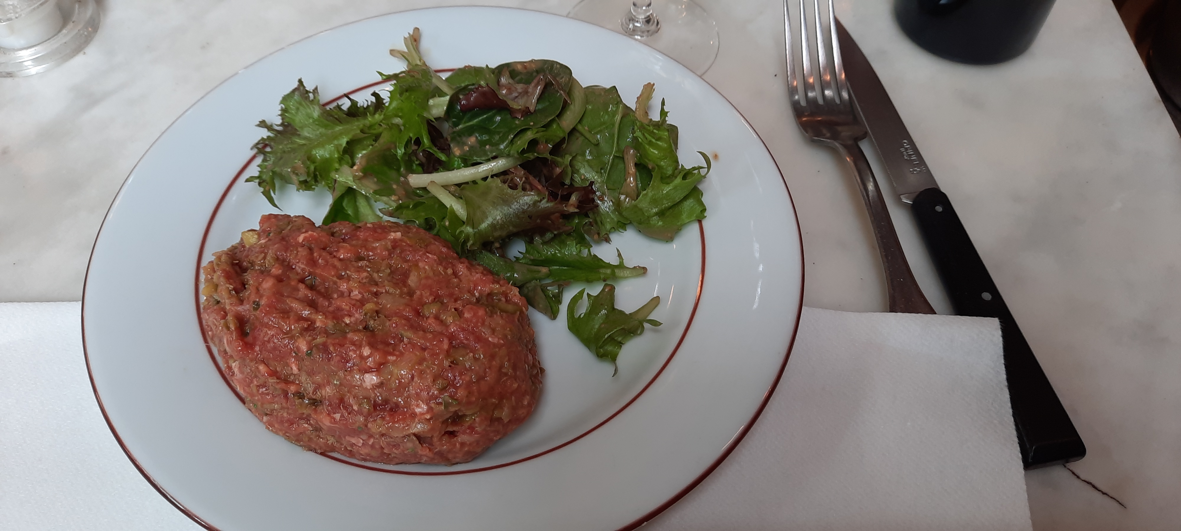 Très bien situé et ambiance. Nous nous sommes retrouvés ici car ils sont ouverts en milieu d'après-midi pour manger (ce qui est parfois difficile à trouver). Le service était très bon. Nous avons été pris en charge rapidement. J'ai eu une salade qui était grande et les légumes verts étaient frais. Il était garni de fromage de chèvre et d'asperges. La vinaigrette aurait pu être un peu plus savoureuse mais c'était tout à fait acceptable. Mon mari a apprécié son tartare de bœuf. Ils ont une bonne carte des vins et nous avons apprécié une belle bouteille de rose. Dans l'ensemble, c'est un bon rapport qualité-prix, des portions de bonne taille et un emplacement idéal. Je mangerais encore ici.,
