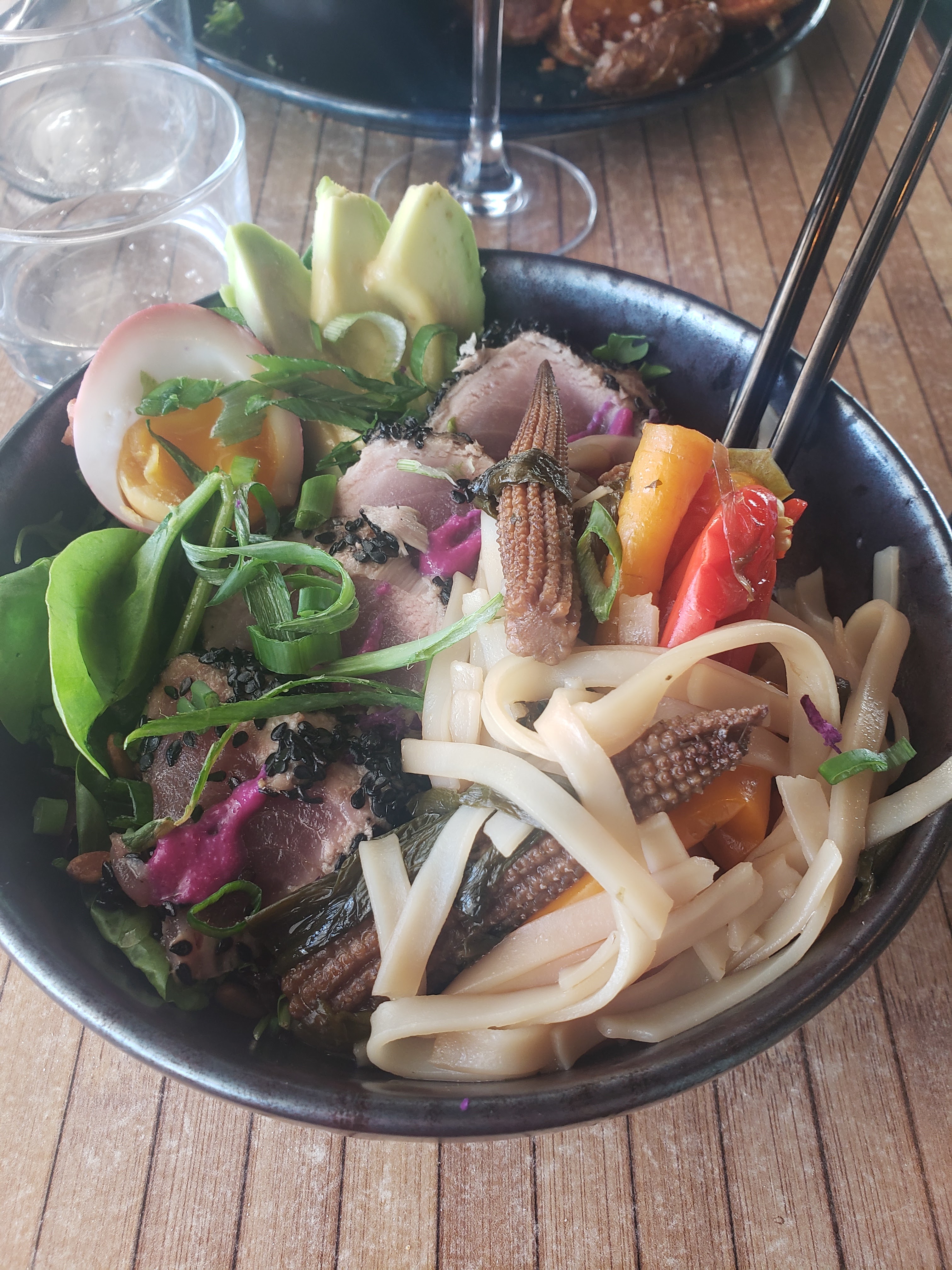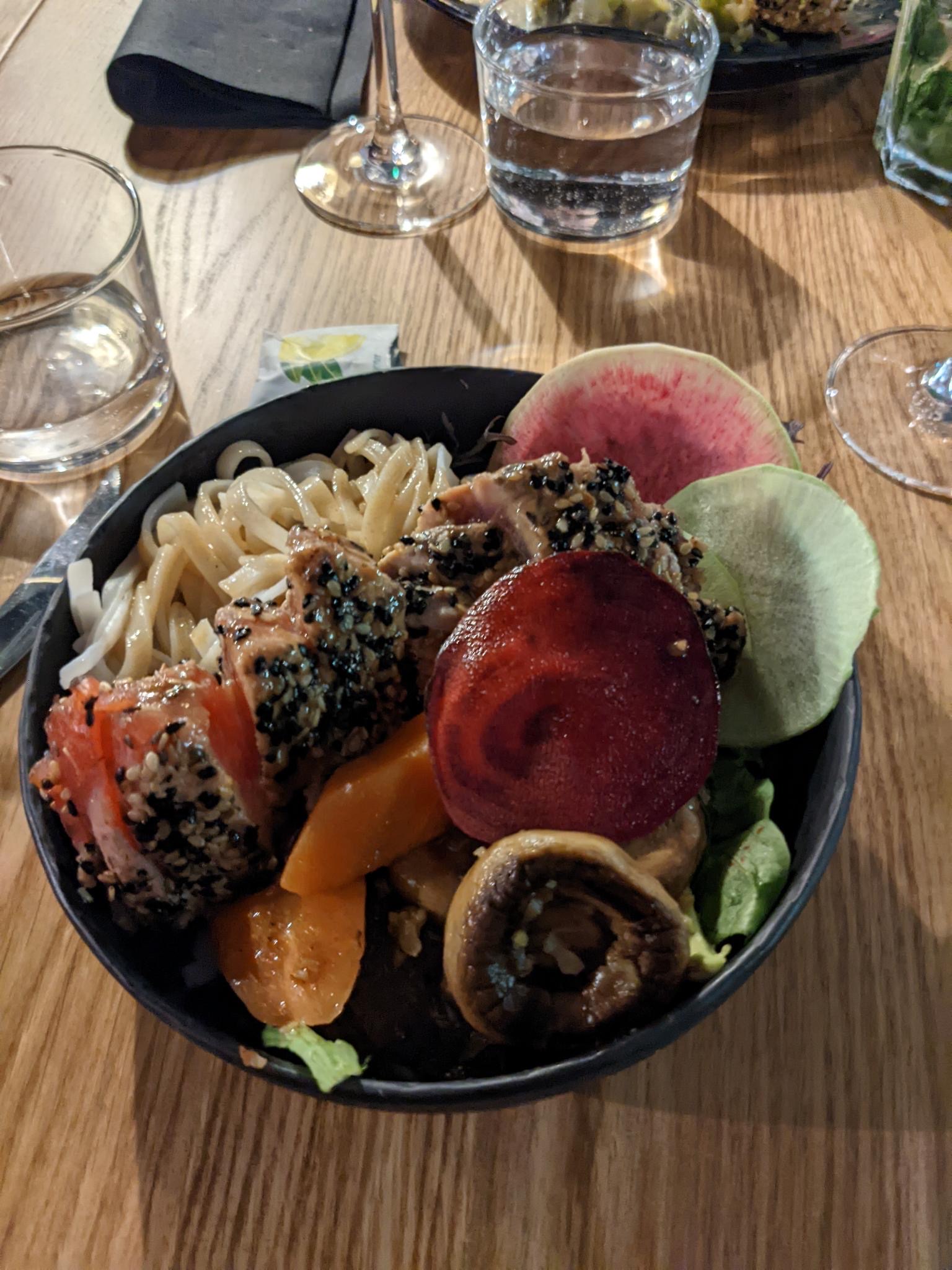 Première expérience dans ce restaurant, personnel très accueillant et disponible J’ai choisi un Tataki de thon façon Thaï, peut Faire mieux, au Japon on ne coupe pas les pâtes ,c’est mieux pour manger avec les baguettes, betteraves crues inutiles, sauce thaï pas trop thaï. Mon épouse une blanquette aux algues, pas vu les algues, lorsqu’on avance un produit il doit être identifiable et ce n’est pas l’espuma qui peut relever le tout. je chipote dans l’ensemble c’était très correcte, jusqu’au dessert , les cannelés au gin, gin pas vu, figues rôties, en réalité les figues n.étaient pas rôties mais crues pas mûres et immangeables, avertit la direction, n’a pas été choquée, pas un café en compensation ´