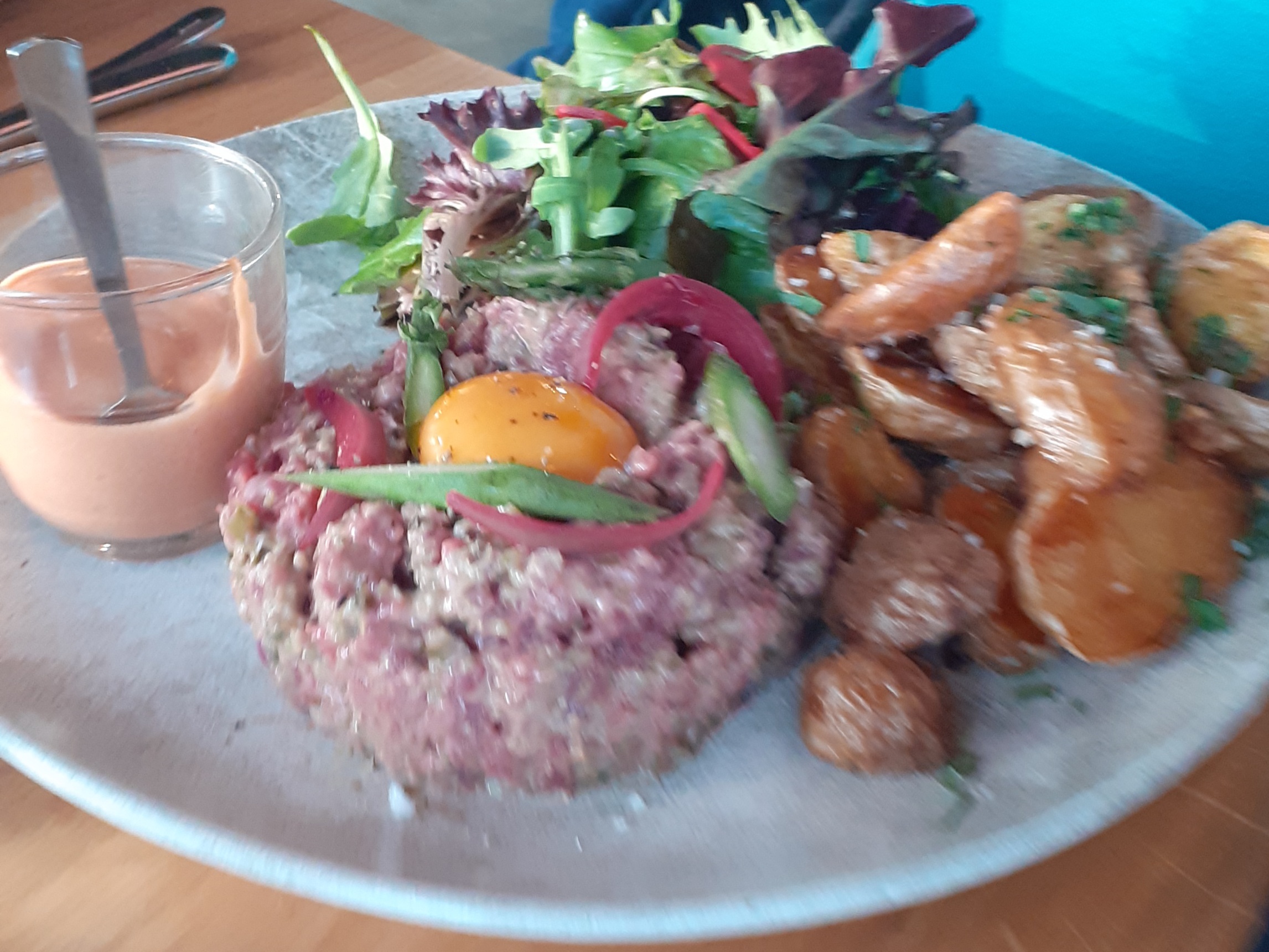 Décor sympa et un personnel ADORABLE, souriant et serviable. Ils acceptent les chiens et mettent à dispo une gamelle d’eau 😉👍. Cuisine fraîche. On a pris une tartine avocado (délicieuse avec son tartare de tomates relevé), un tartare de bœuf bon et une salade de poulpes malheureusement fade. Les poulpes sont justes grillé, il aurait fallu les mariner un peu ou mettre qqs épices. Au global, ça reste un bon restau 😊. Pensez à réserver.