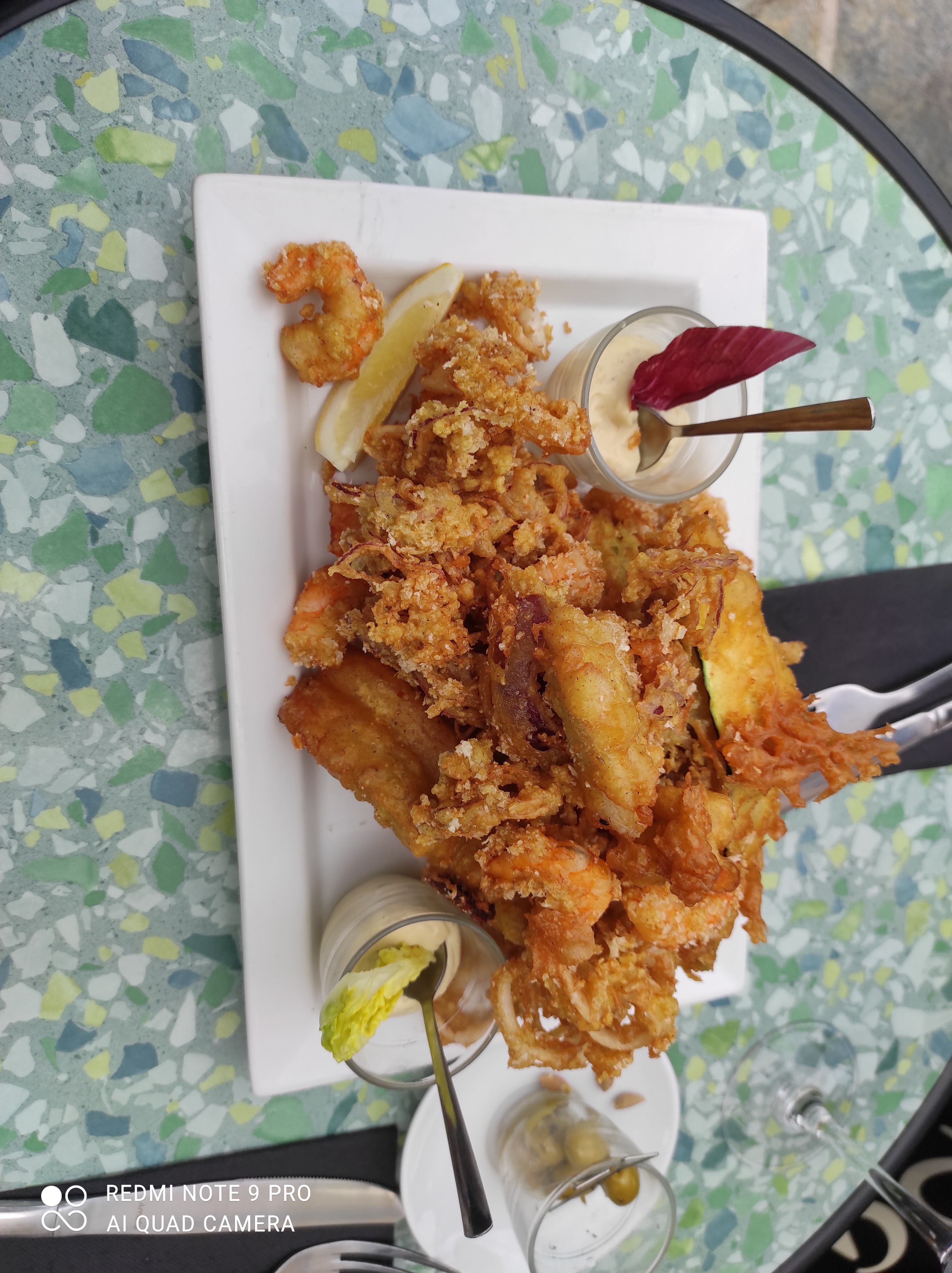 Deux charmantes serveuses l'une Française l'autre Lettone se sont occupées de nous. Nous avons pris deux tapas à partager à 5. Attention c'est bon et copieux. On a eu du mal à finir nos plats. Le service est toujours sympa nous ne faisions d'habitude que boire un verre il était temps d'essayer les plats, pour nous l'attente n'a pas été trop longue. Les proportions sont parfaites si on évite les tapas, ou on peut se faire un repas de tapas entre amis comme les espagnols avec des verres ! Il faut excuser l'absence de vue... Leur palissade cache le chantier du port. Ils auraient déjà dû avoir un nouveau local.