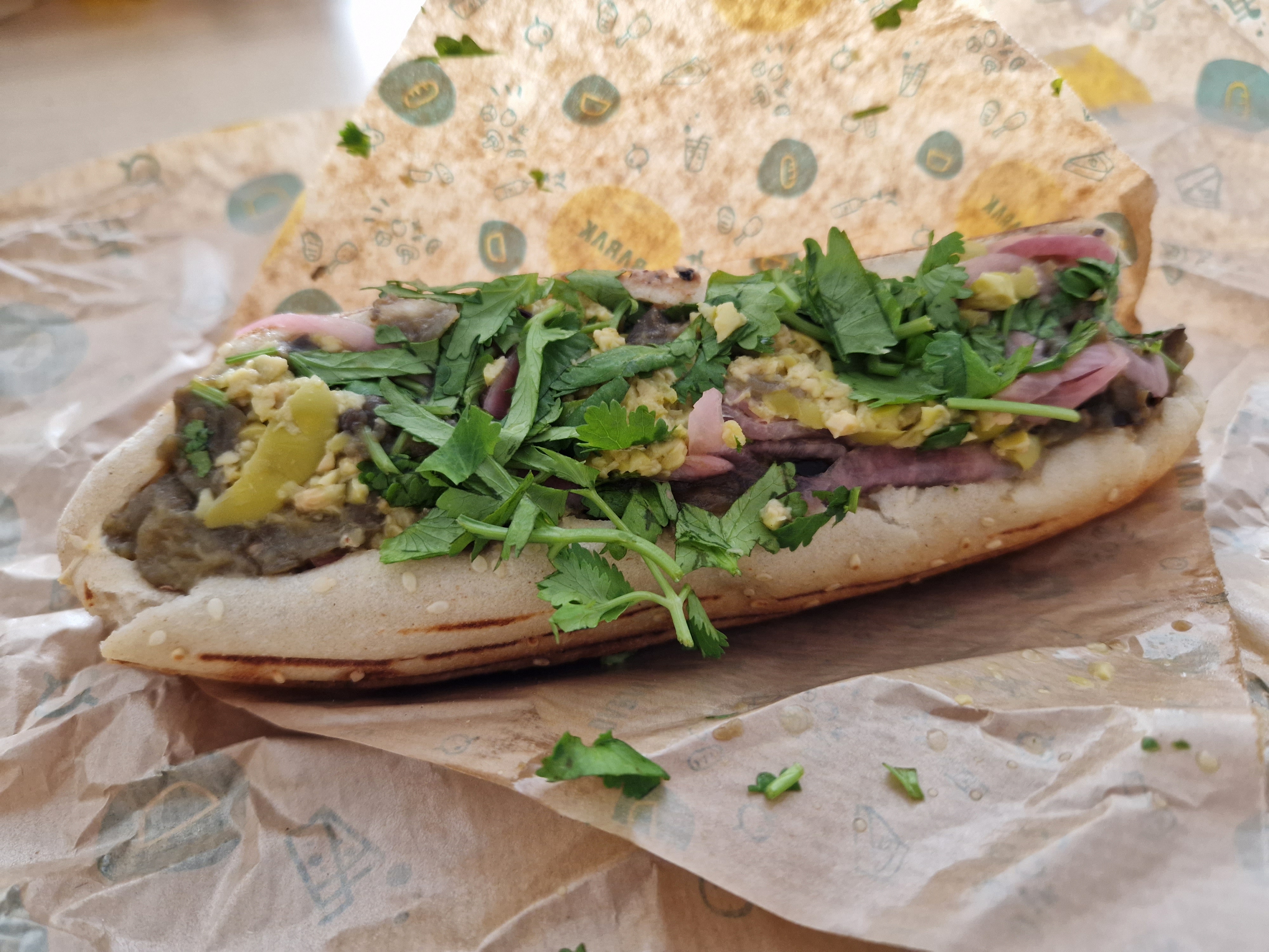 J’ai pris un sandwich poulet à emporter. Le pain était très pâteux et complètement détrompé par les ingrédients et la sauce. Je reste assez mitigée en ce qui concerne l’association des saveurs, il y’en a un peu trop à mon goût ( une sauce curry, aubergine sans goût, poulet émietté, pickles, oignons,carottes, tomates, olives, coriandre, etc …) Point positif Quantité généreuse.