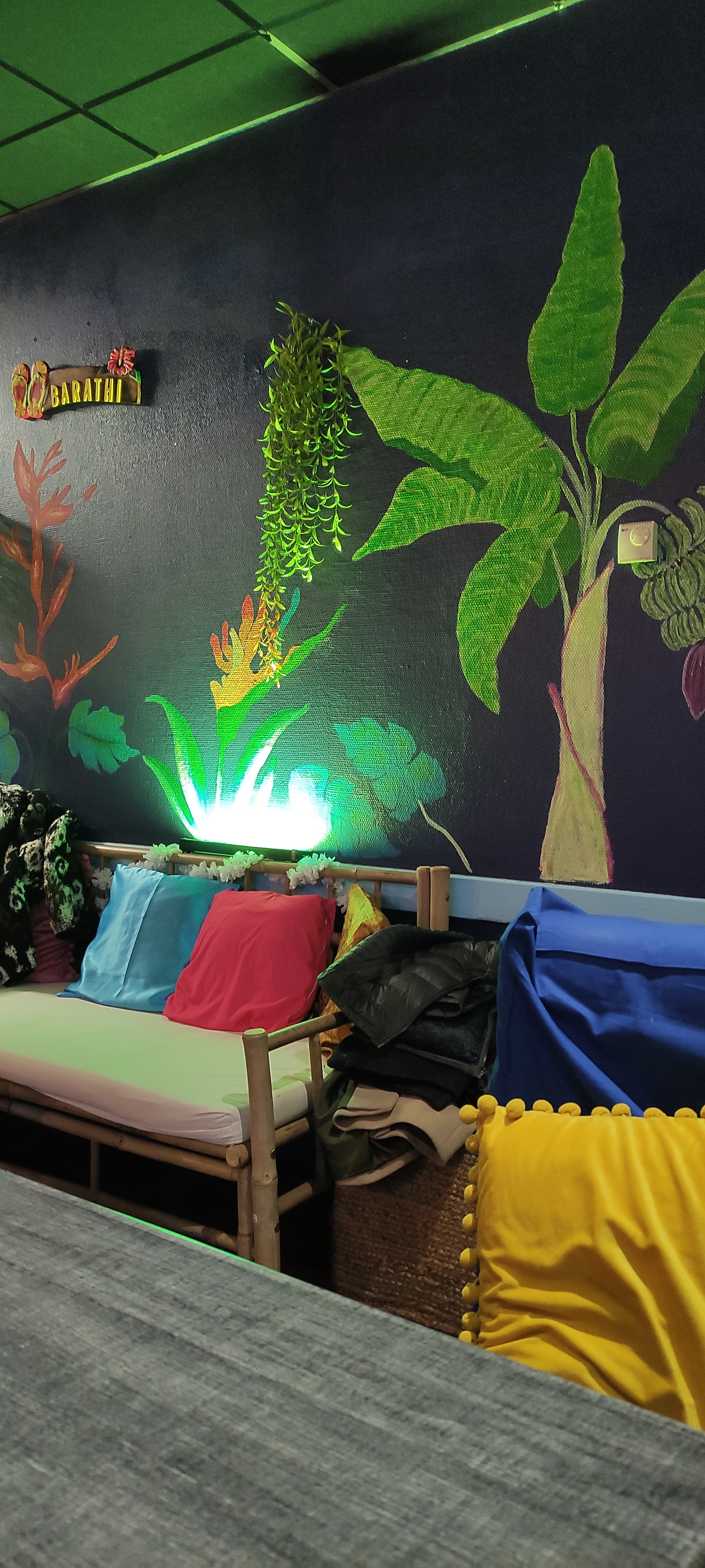 Quel voyage dans ce nouveau bar en face des halles de st Étienne (parking public à côté) ! Couleur, douceur, cocktails de fruits frais incroyables , tapas sans gluten faits maison … une belle découverte au fin fond de l’Inde et de la Réunion … le décor est top avec une fresque murale peinte à la main qui porte à la rêverie … merci Asvina et Eddy pour votre accueil.. nous reviendrons 👍❤️