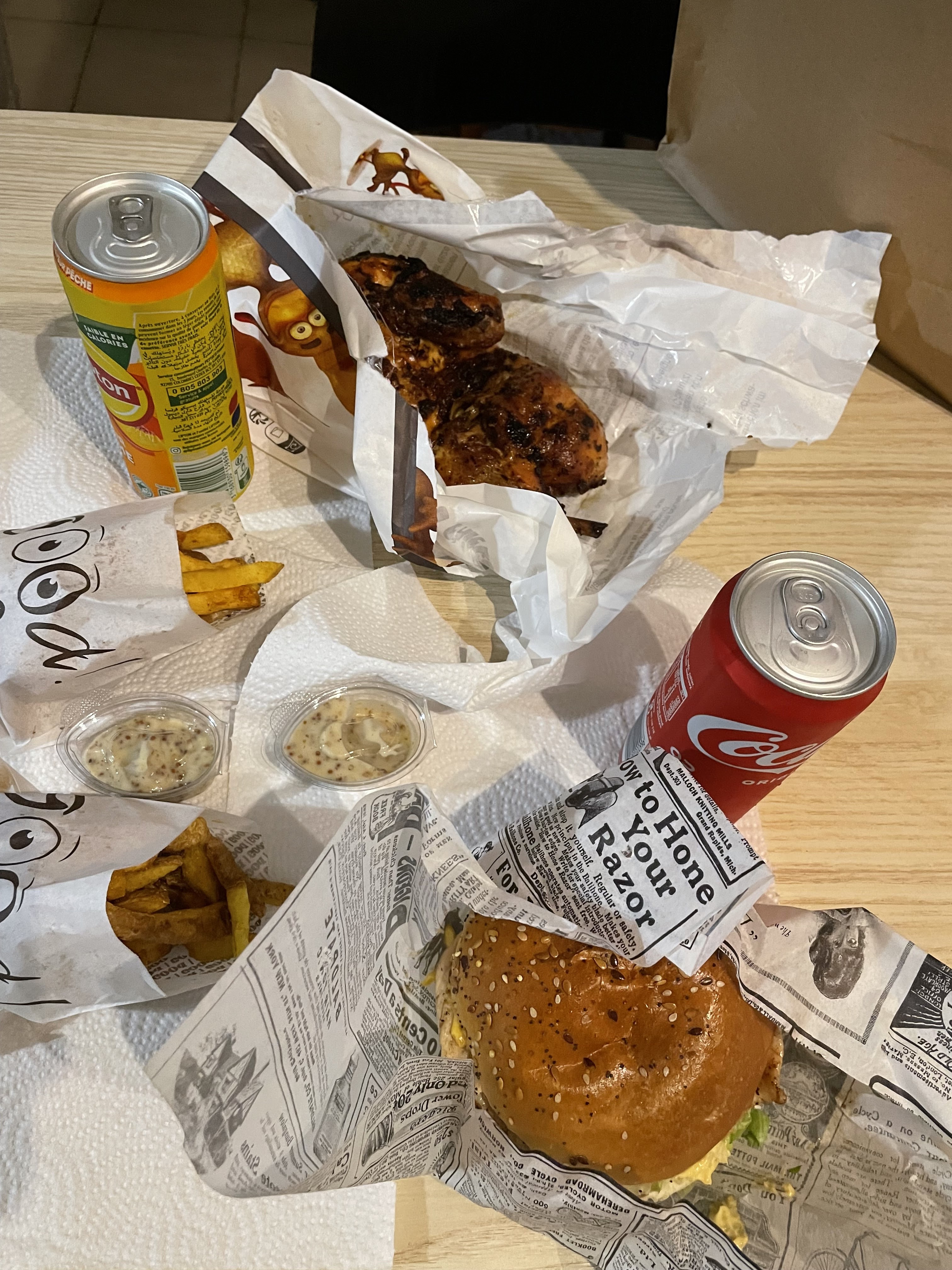 Trop trop bon !! Je suis super contente , j’ai pris un demi poulet et ma copine un burger. Le poulet était délicieux , et j’ai beaucoup aimé les frites . Ma copine a également aimé le burger .