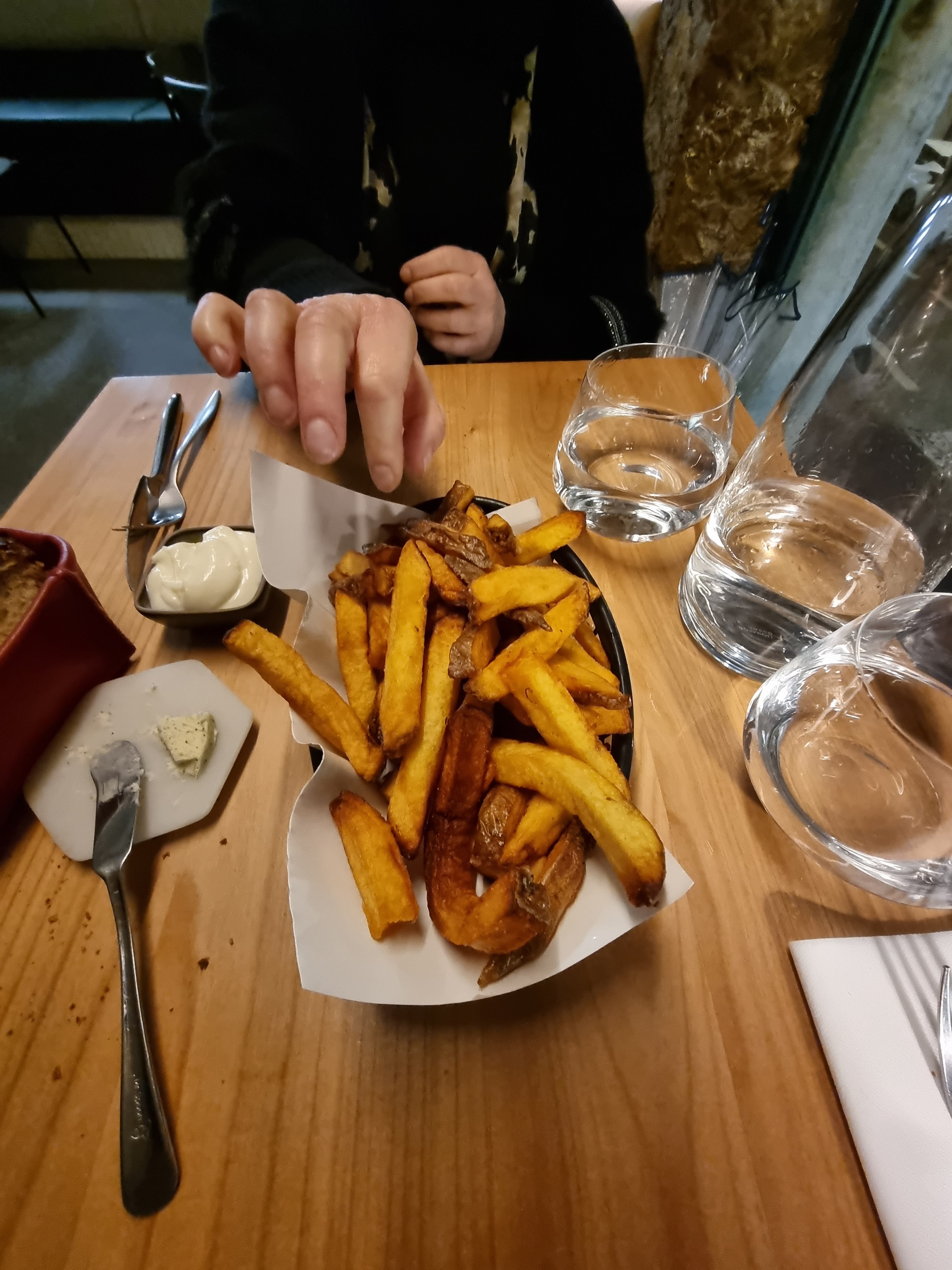 Frites en 2 cuissons excellentes. Le topinambour et le poireau très bon. Les desserts pas mal du tout non plus même si je les trouve un peu cher à 10 euros.... Du très bon pain de chez Antoinette, une serveuse souriante et une super sympa. Un endroit cosy à l'étage. Bref une bonne adresse à retenir
