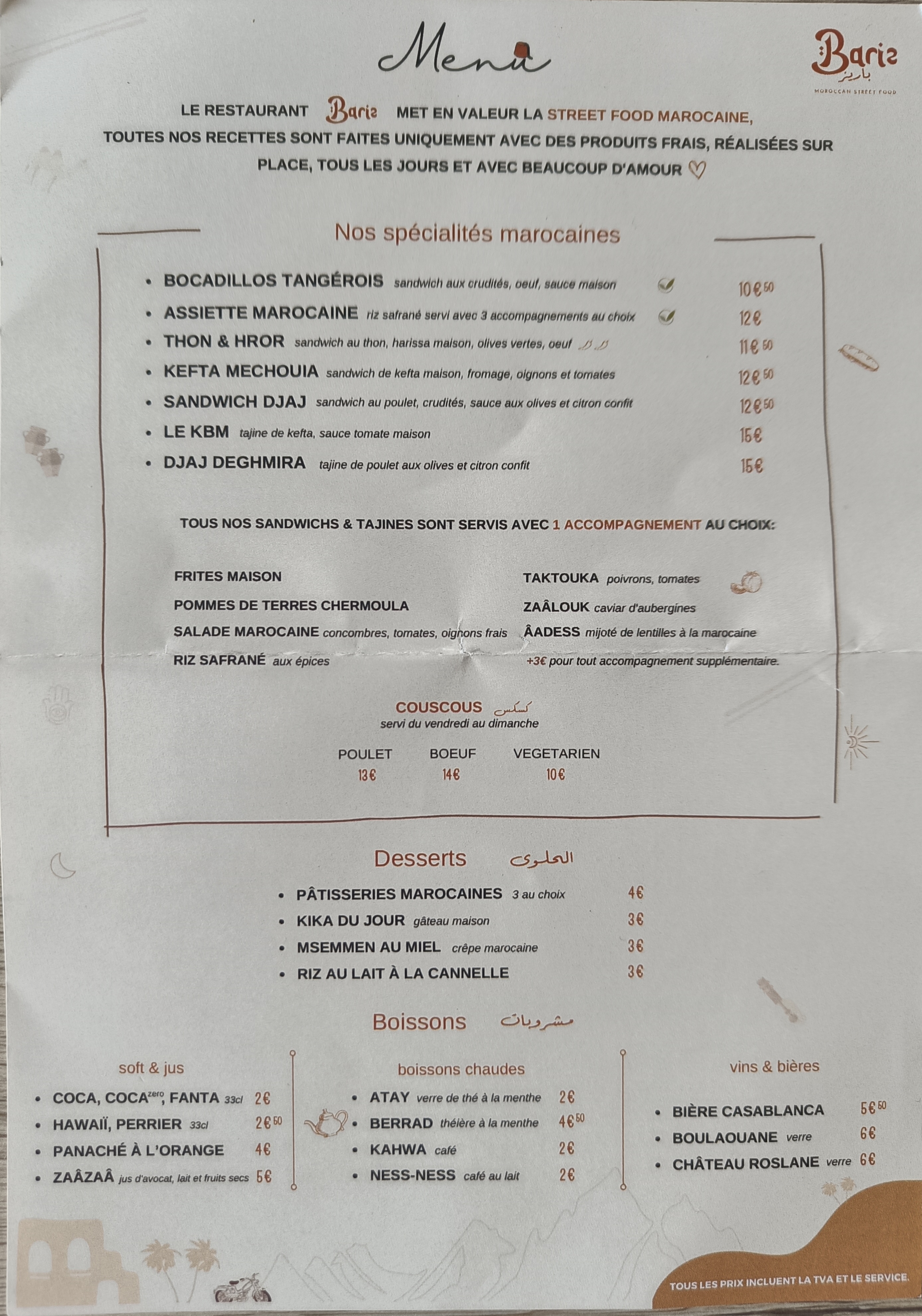 On à testé aujourd'hui le resto Bariz C'est petit bijou de food street marocain j'ai énormément apprécié le tajine poulet daghlirra avec frites maison et mes 3 amis ont pris les sandwichs feta et poulet avec frites maison c'était un vrai délice. On reviendra merci à la dame au service très gentille