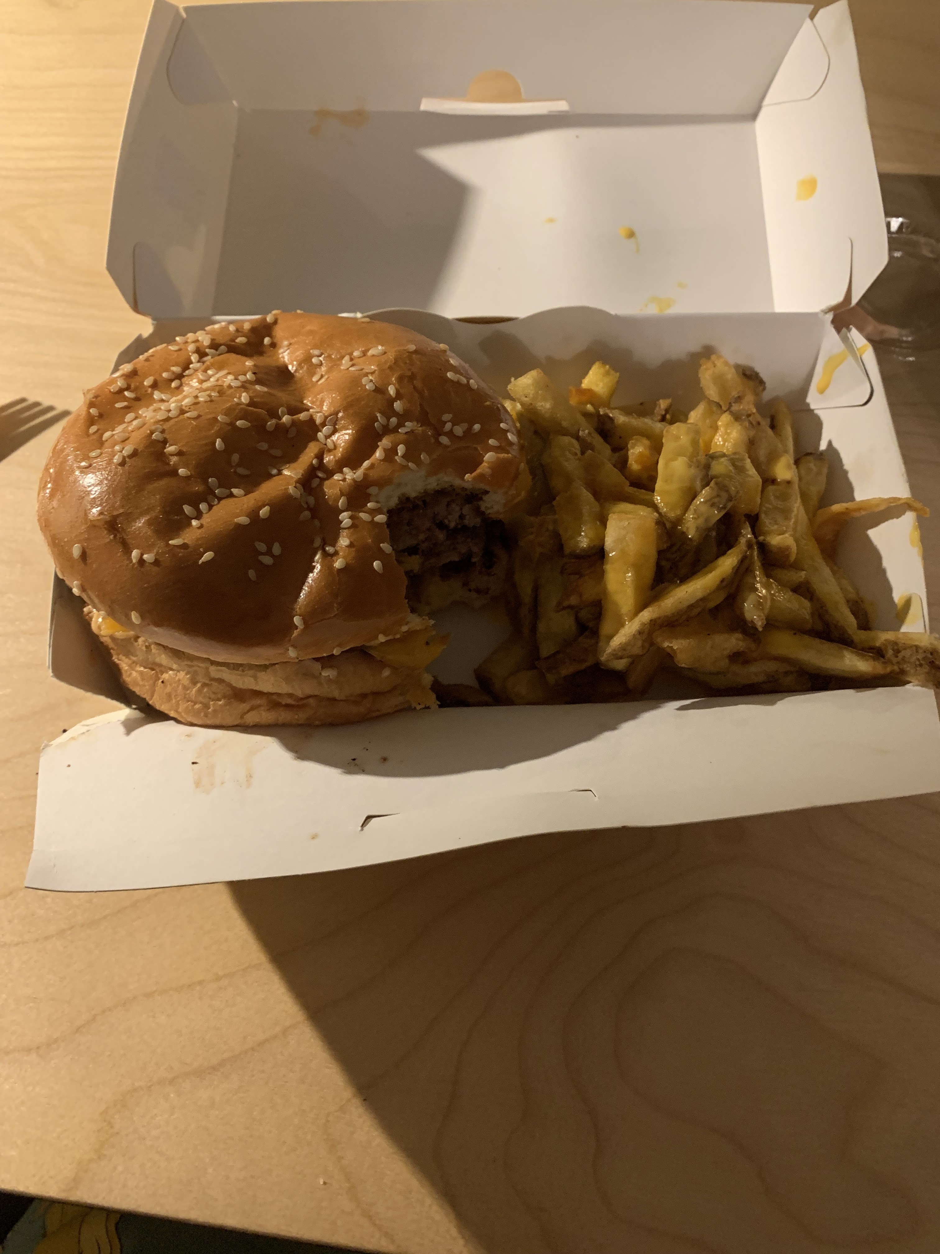Burger pris à emporté, les frites un délice, le burger très bon avec une bonne sauce, le seul hic j avais demandé saignant pour la cuisson et non à point mais j’ai tout mangé quand même 😅