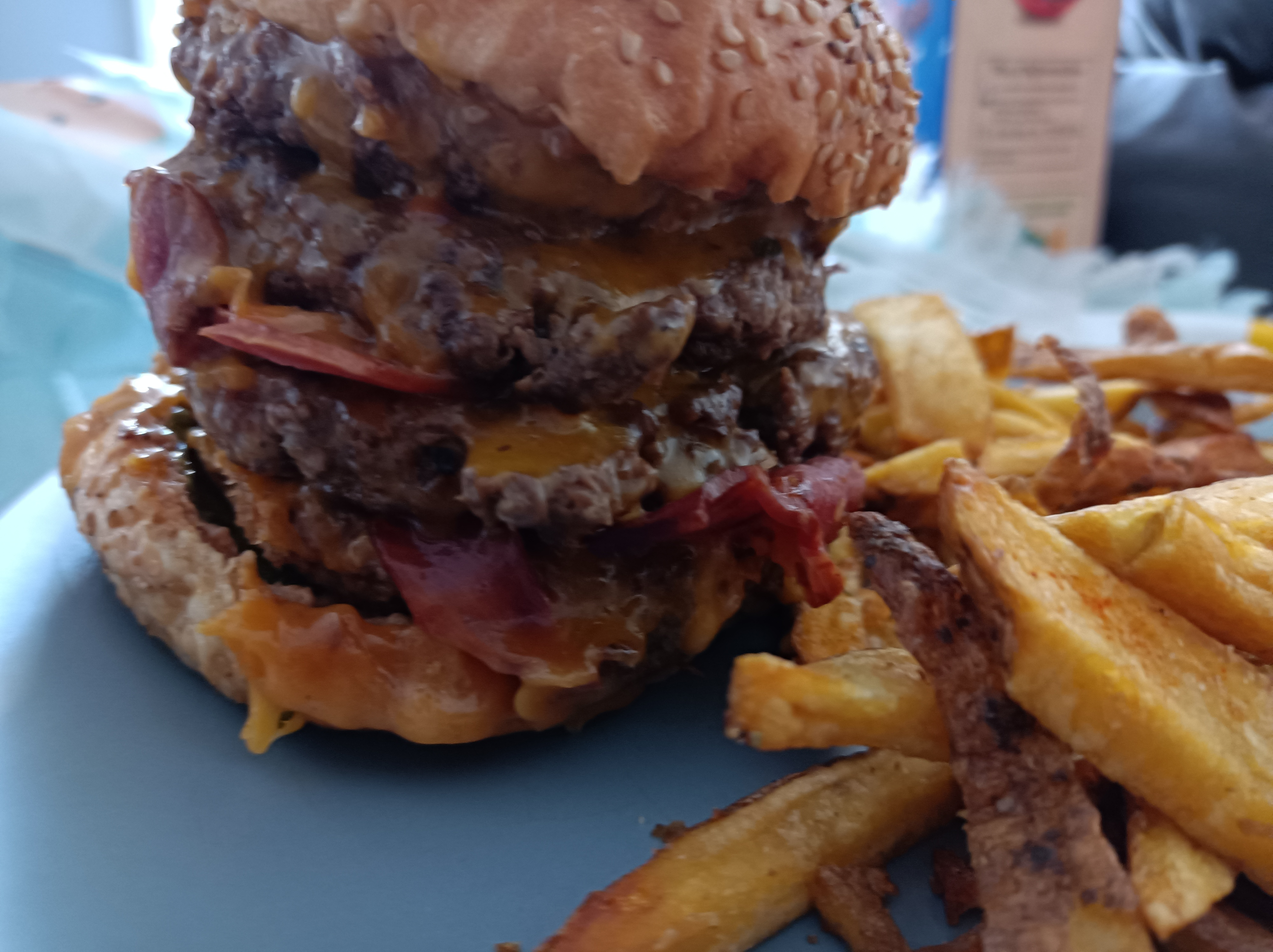 Franchement classique rien d’extra viande surgeler moi qui mange bleu le steak est blanc autour 🤣 burger 2 steak sans bacon canette 14,50 un peu excessif pour la qualité de la viande frite son bonne là dessus rien à dire c’est un un burger classique faite pas 1h de route et ne pas croire les story c pas comme on vous le montre forcément