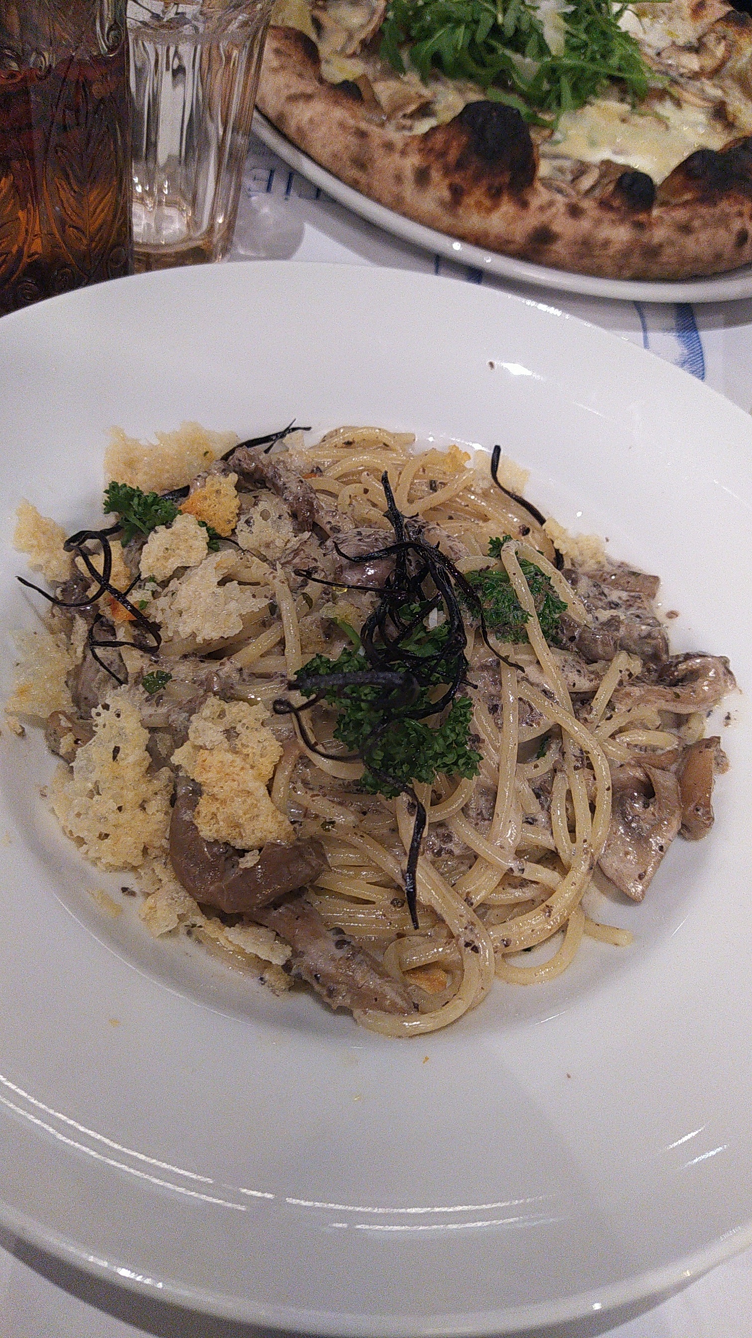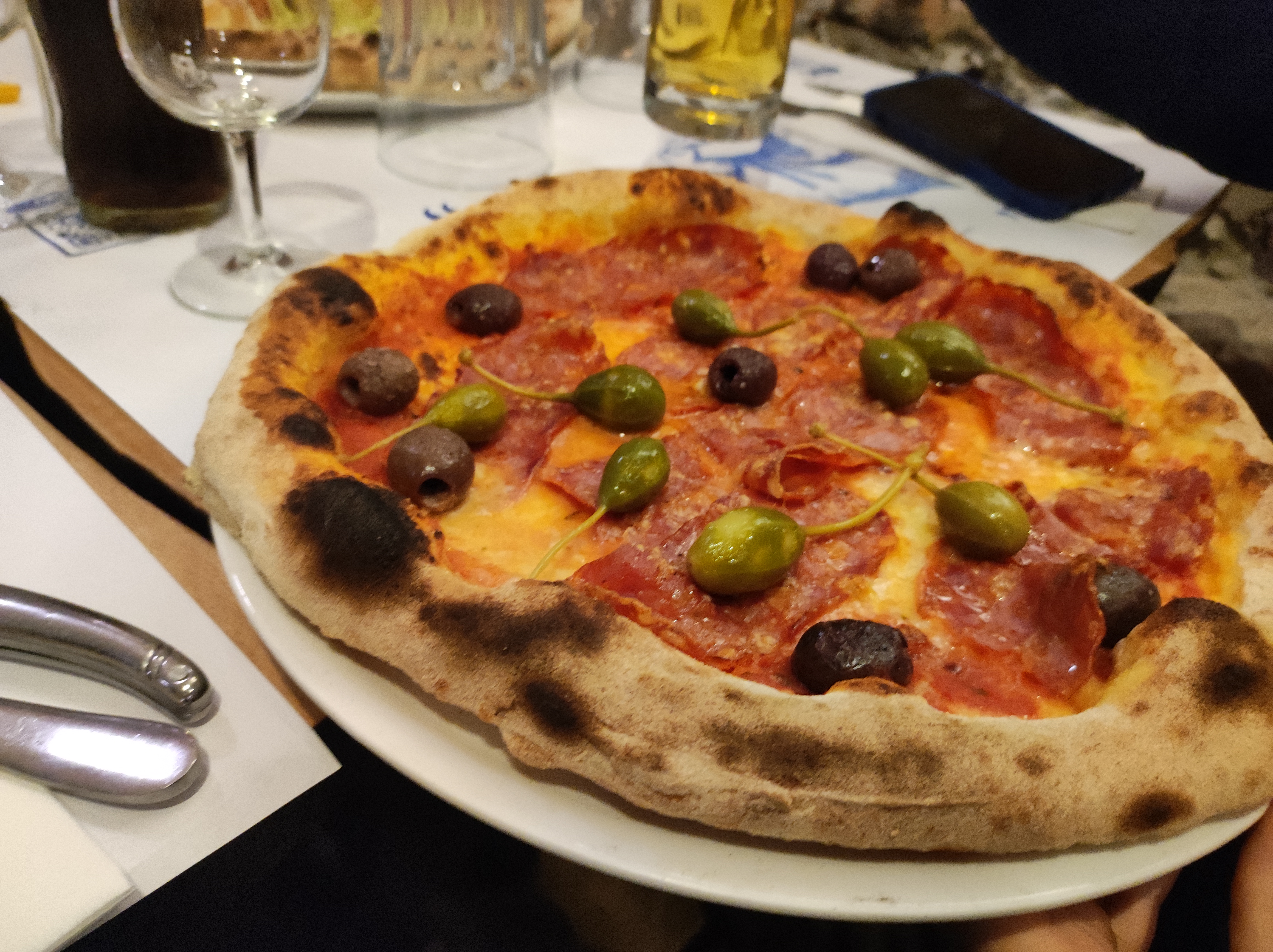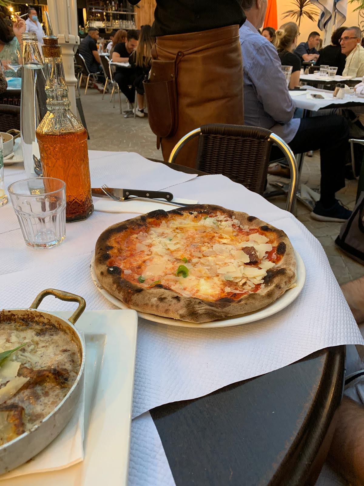 La pâte à la truffe et la bruschetta étaient excellentes, la pizza était bonne mais la Diavola était un peu trop salée avec son salami épicé, ses câpres et ses olives. Le problème principal a été qu'ils ont refusé de nous faire asseoir car nous n'étions pas au complet... nous attendions deux amies. Nous sommes donc restés plantés devant l'entrée pendant plus de 10 minutes alors que nous aurions volontiers attendu avec un cocktail. Mais bon, ce sont leurs règles, c'est leur établissement... je peine à comprendre la logique(pas besoin de réécrire en commentaire vos explications qui ne m'ont pas convaincu). Si j'avais su, j'aurais préféré attendre et prendre un verre dans un bar avant. Je travaille dans le métier de la restauration et du service, je connais donc les contraintes et les enjeux... Donc lorsque je vais au restaurant pour bénéficier d'un service, j'aimerais qu'il soit égal à celui que je fournis dans mon propre travail.