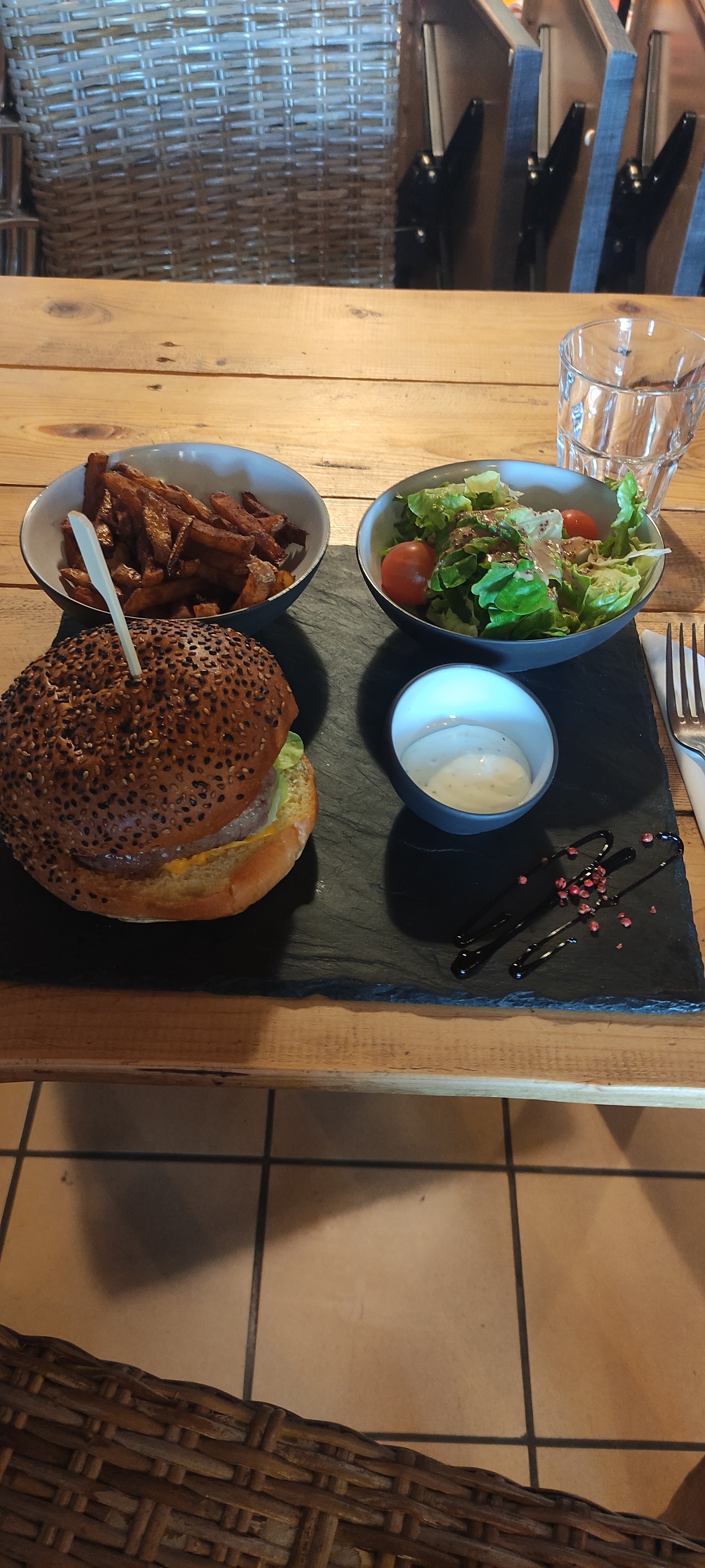 Accueil très chaleureux 🥰 Le Burger 🍔 est délicieux, salade et frites maison mimmmm! Nous reviendrons