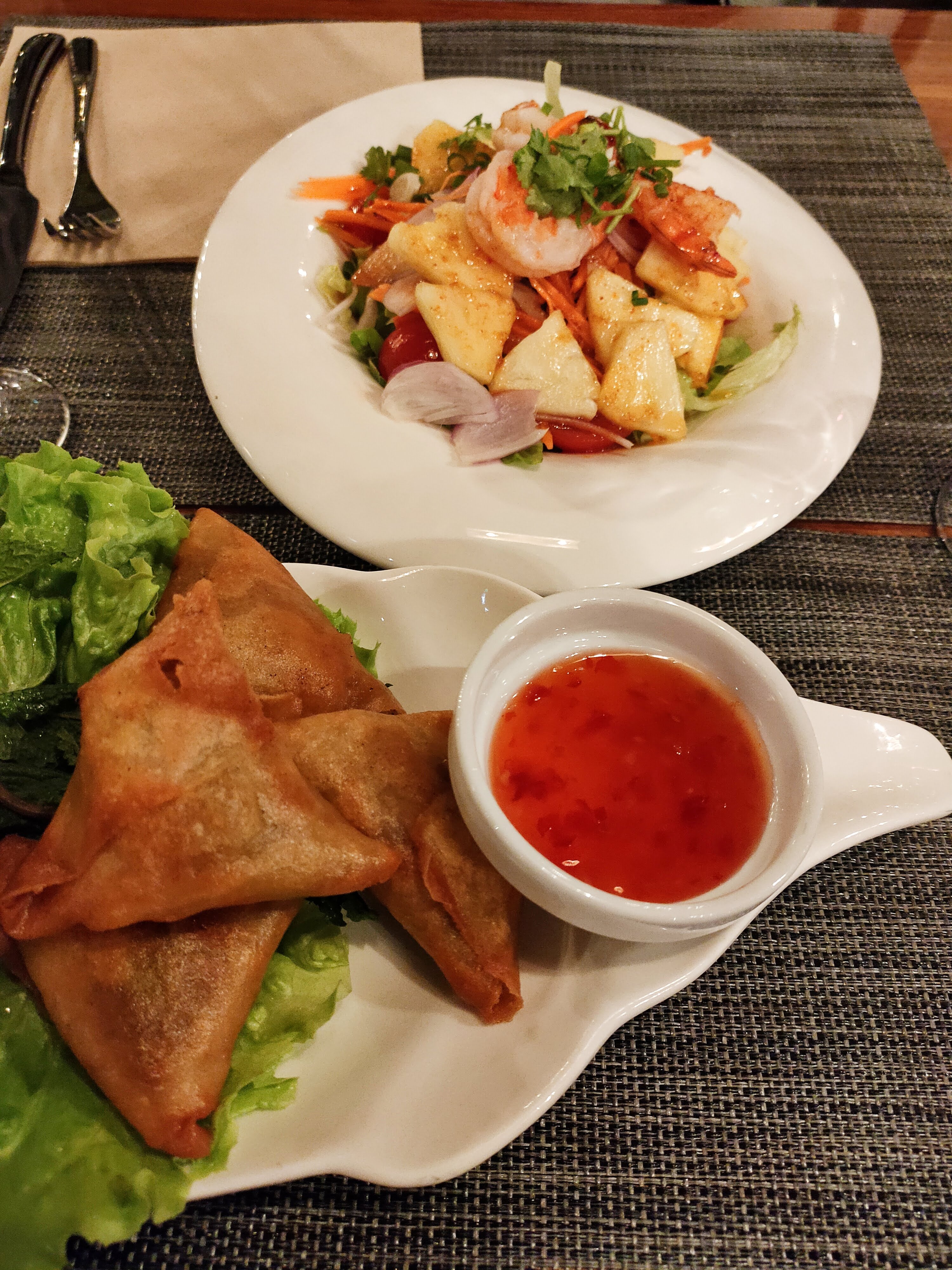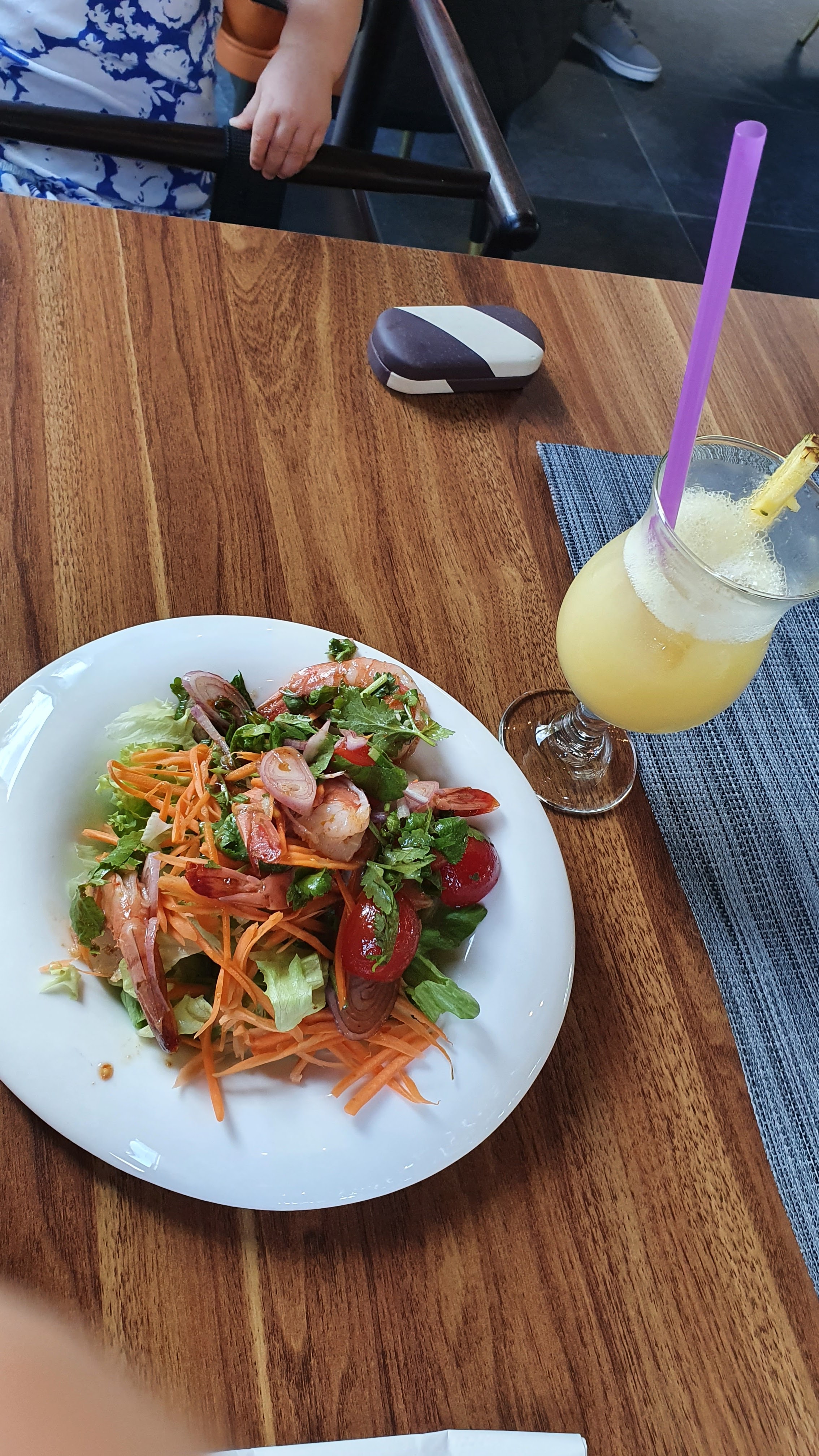 Restaurant à la décoration simple. La carte n'est pas donnée mais c'est un peu comme tous les restaurants Thaïlandais. Côté plats je trouve dommage de présenter dans des bols , c'est un challenge de consommer sans en mettre partout, du moins pour les gambas pour lesquelles il était impossible de les manger puisque sous la panure elles n'étaient pas décortiquées, quelle surprise pour la première bouchée! Le riz est servi dans un bol à part avec sa cuillère mais pareil tellement plein qu'on en met partout , bref pour ma part pas une réussite même si le goût est là.