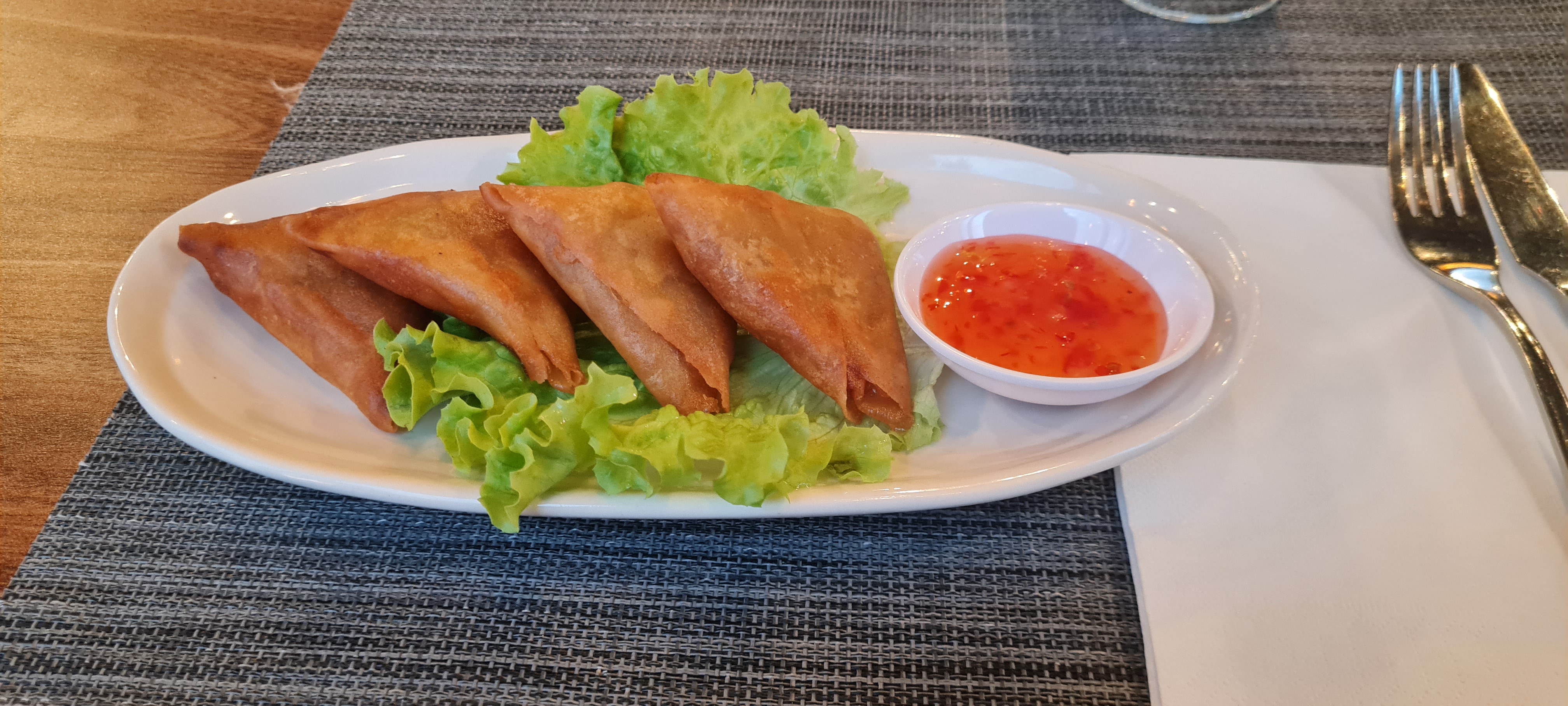 Nous avons commandé trois menus avec des nems et samosas. Riz poulet curry vert + noix de cajou en supplément, phad Thaï boeuf, Bobun bœuf. Tous les plats étaient excellent, pas trop relevé et bien parfumé. Je vous le recommande.