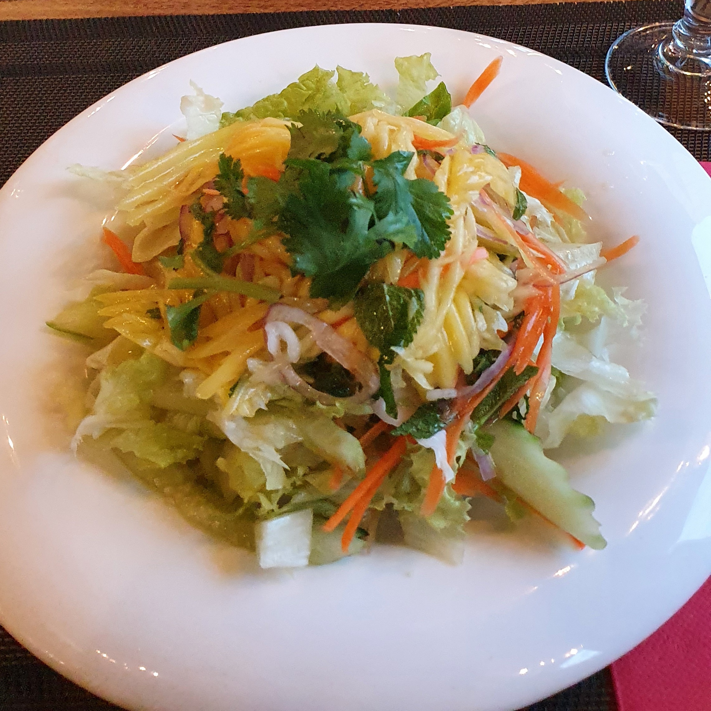 La salle est jolie mais la musique d'ambiance est tellement discrète que l'on a plus l'impression d'être dans un bistrot avec les bruits de cuisines que dans un restaurant Thaïlandais. Les assiettes pour les salades sont très jolies mais pas pratique. Je ne recommande pas le Bò Bún poulet qui a mon goût était beaucoup trop salé. Sinon, le service était rapide, tellement que le plat est arrivé avant que nos assiettes de l'entrée soit débarrasser.