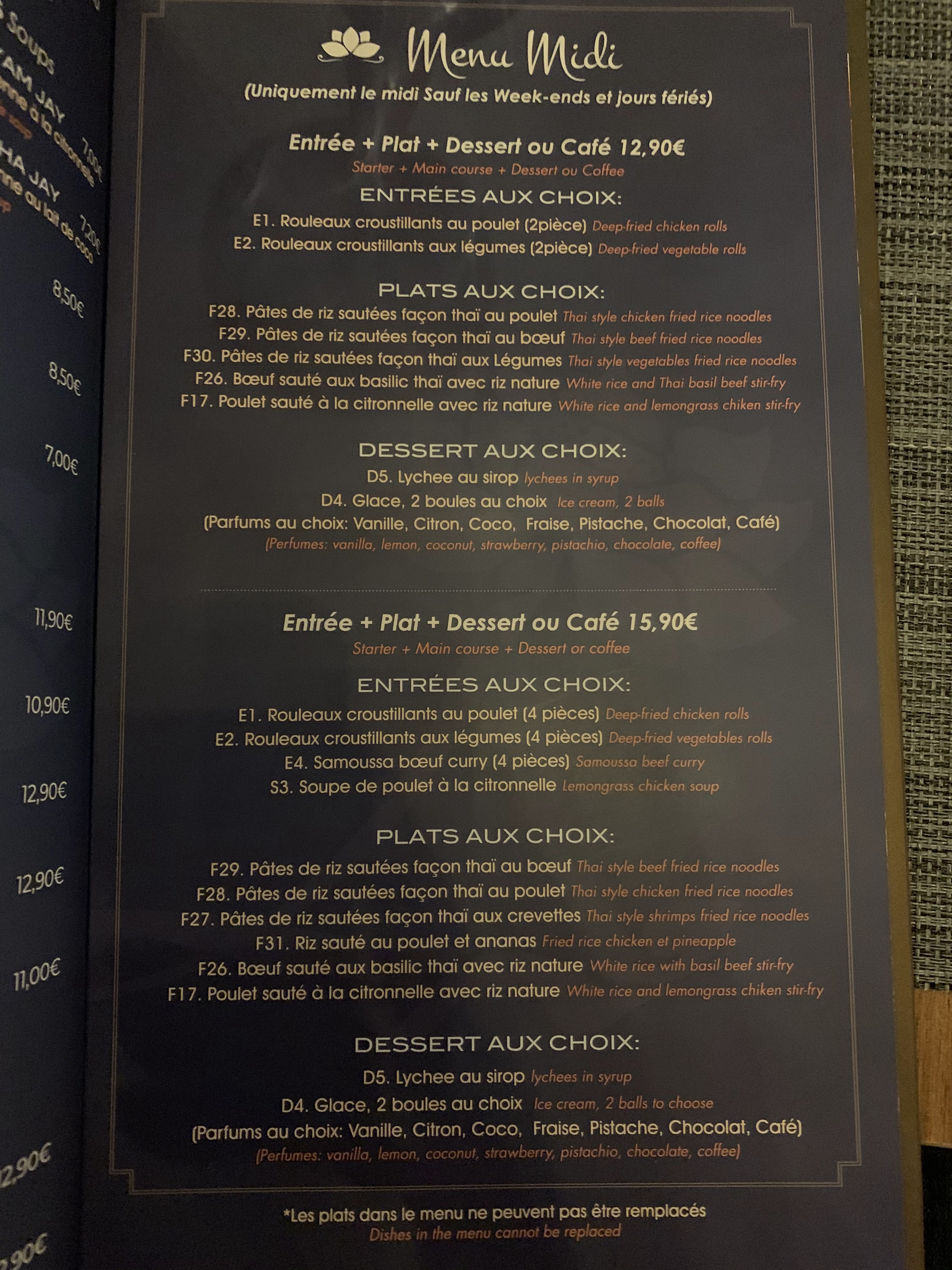 Bon accueil, servi rapidement, les pâtés impériaux sont bons , les pâtes thai aux crevettes sont copieux , agrémentés de piments , cacahuètes et cotron vert . 2 menus uniquement, tarifs raisonnables.