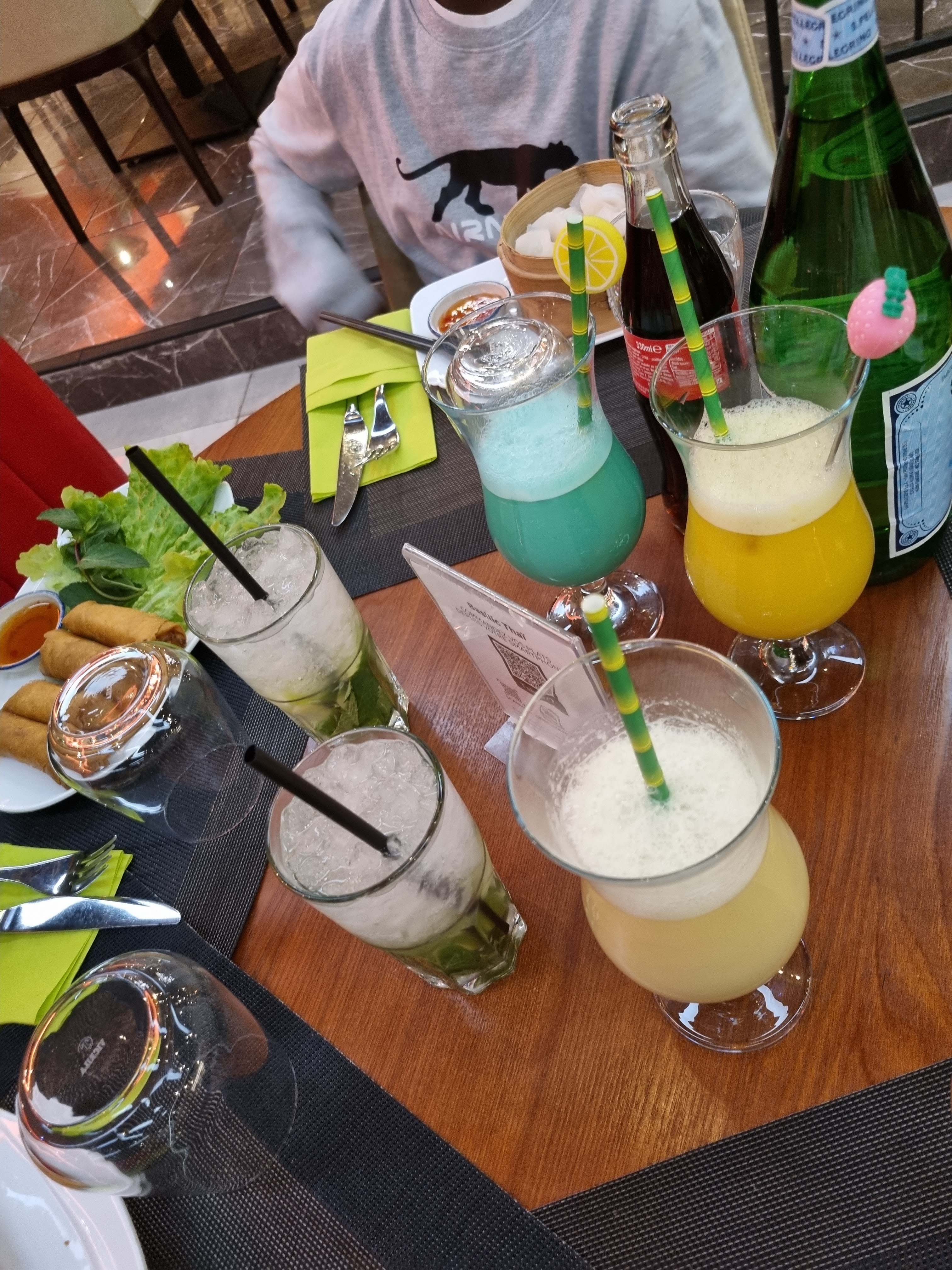 Nous avons réservé une table pour 2 personnes à 20h30, la commande se pase via QR code. Les cocktails apéritif sont arrivés 20 minutes après commande, les entrées à 21h45, on a du annuler les plats principaux pour être au cinéma à 22h. Je vous recommande ce restaurant si vous aimez l'attente et manger du thai dans le bruit.