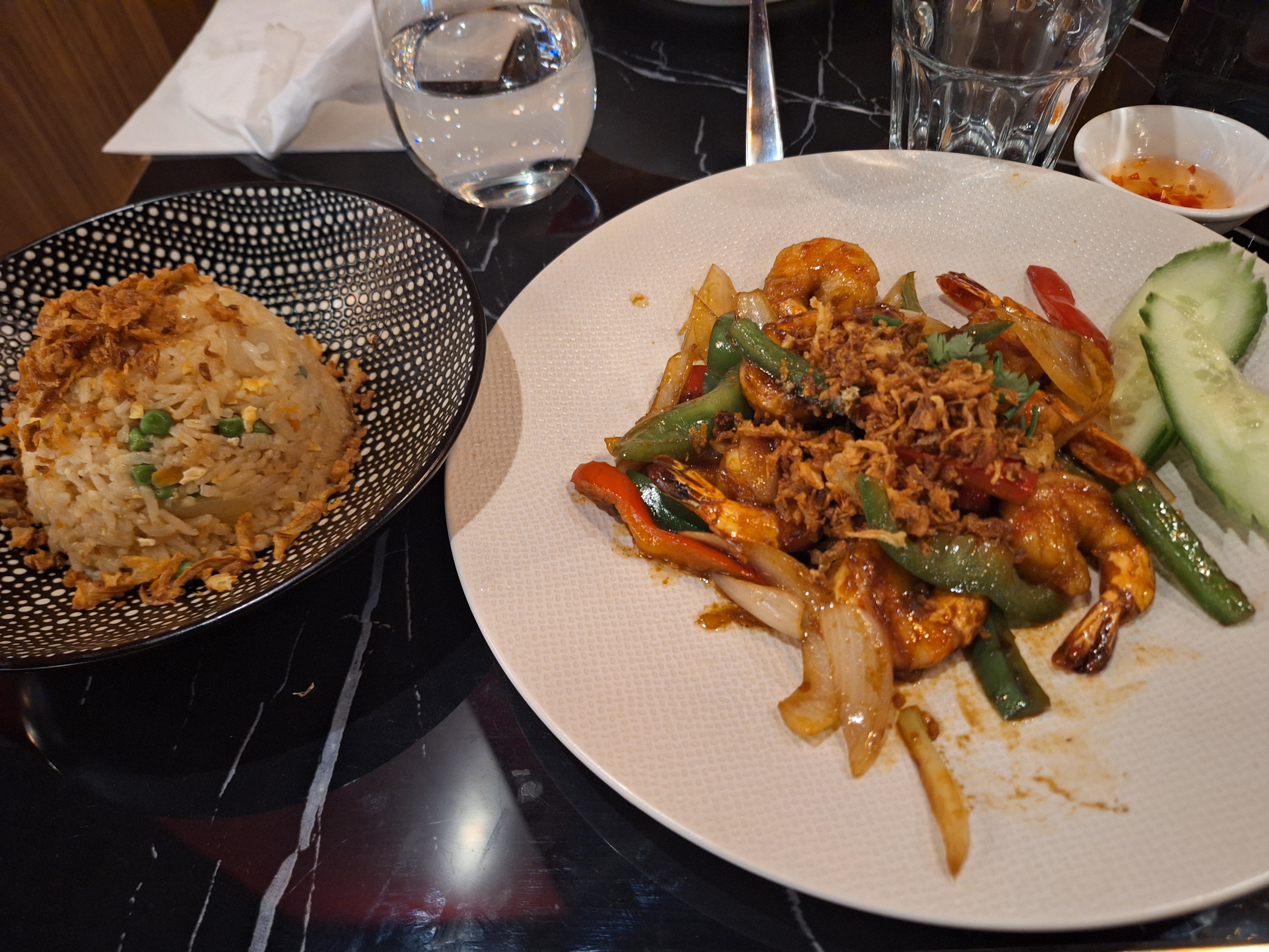 Très bon accueil, grande salle spacieuse propre. J'ai pris un curry rouge crevettes légèrement piquant avec un riz thaï , Très très bon beaucoup de goûts, le riz thaï moyen je l'ai trouvé pâteux. Mais correct quand même. Je recommande vivement