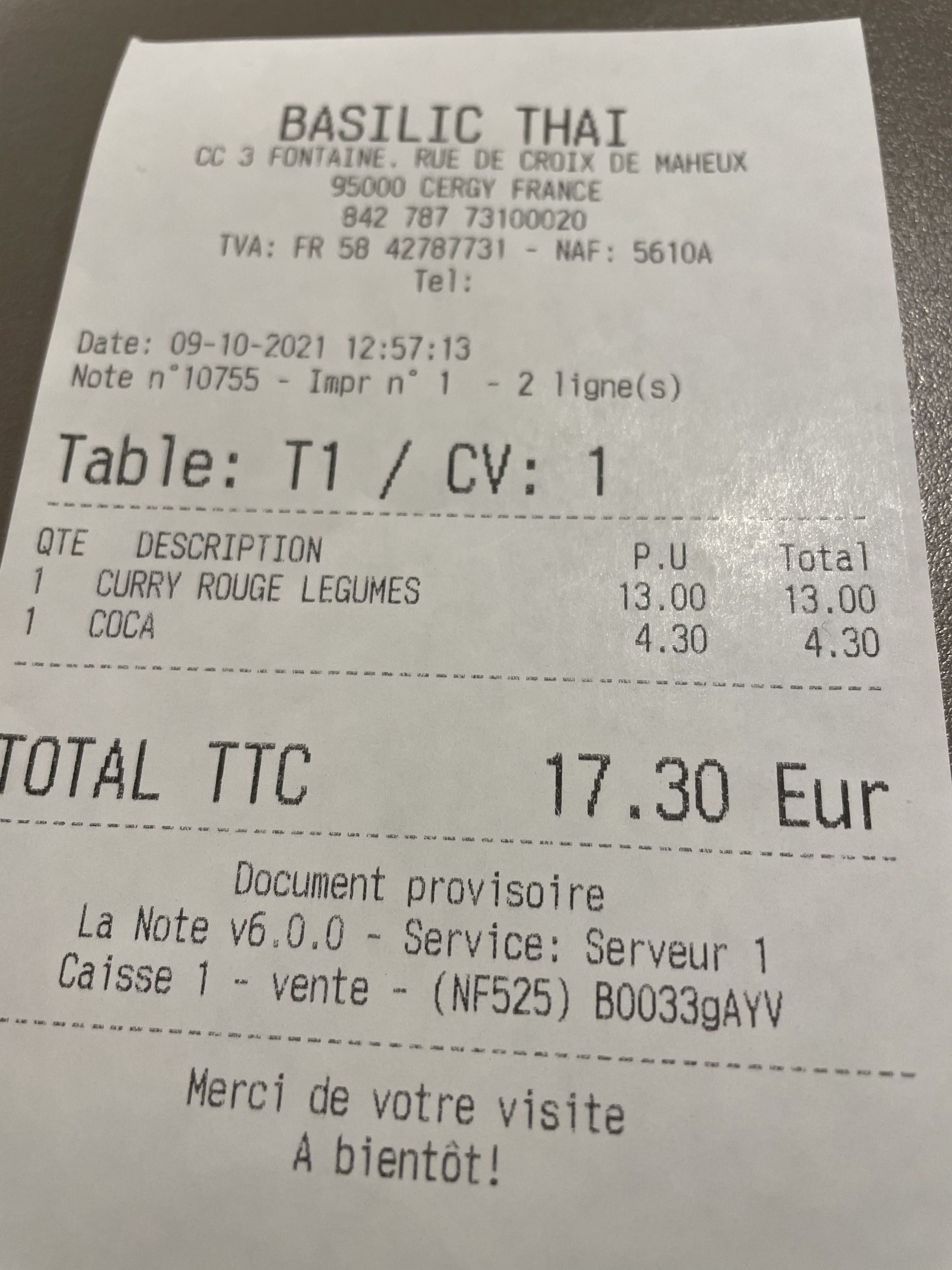 Extrêmement déçu. Les plats emportés étaient fades et en bonus ma femme s'en sentie mal après. Du coup soirée gâchée par les maux de ventre et les nausées par un truc pas frais. Terminé on ne retournera pas au Basilic Thai Cergy.