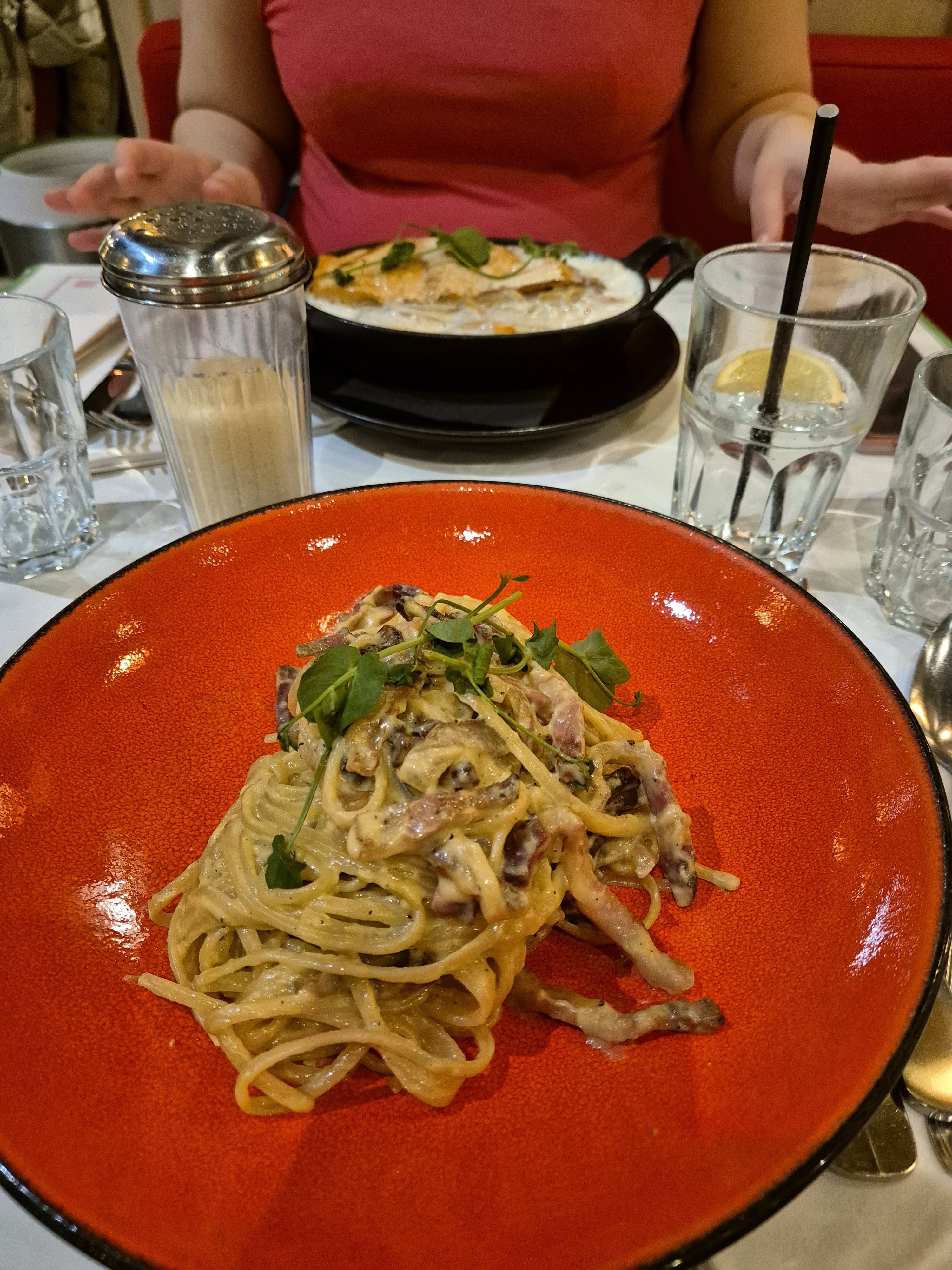Les plats sont très bons et très copieux. Des linguines à la carbonara, escalope milanaise, et salade césar au top ! Dessert délicieux ! Service très agréable. Ça fait deux fois qu'on y vient , jamais déçu. Décor très original ! Je recommande vivement