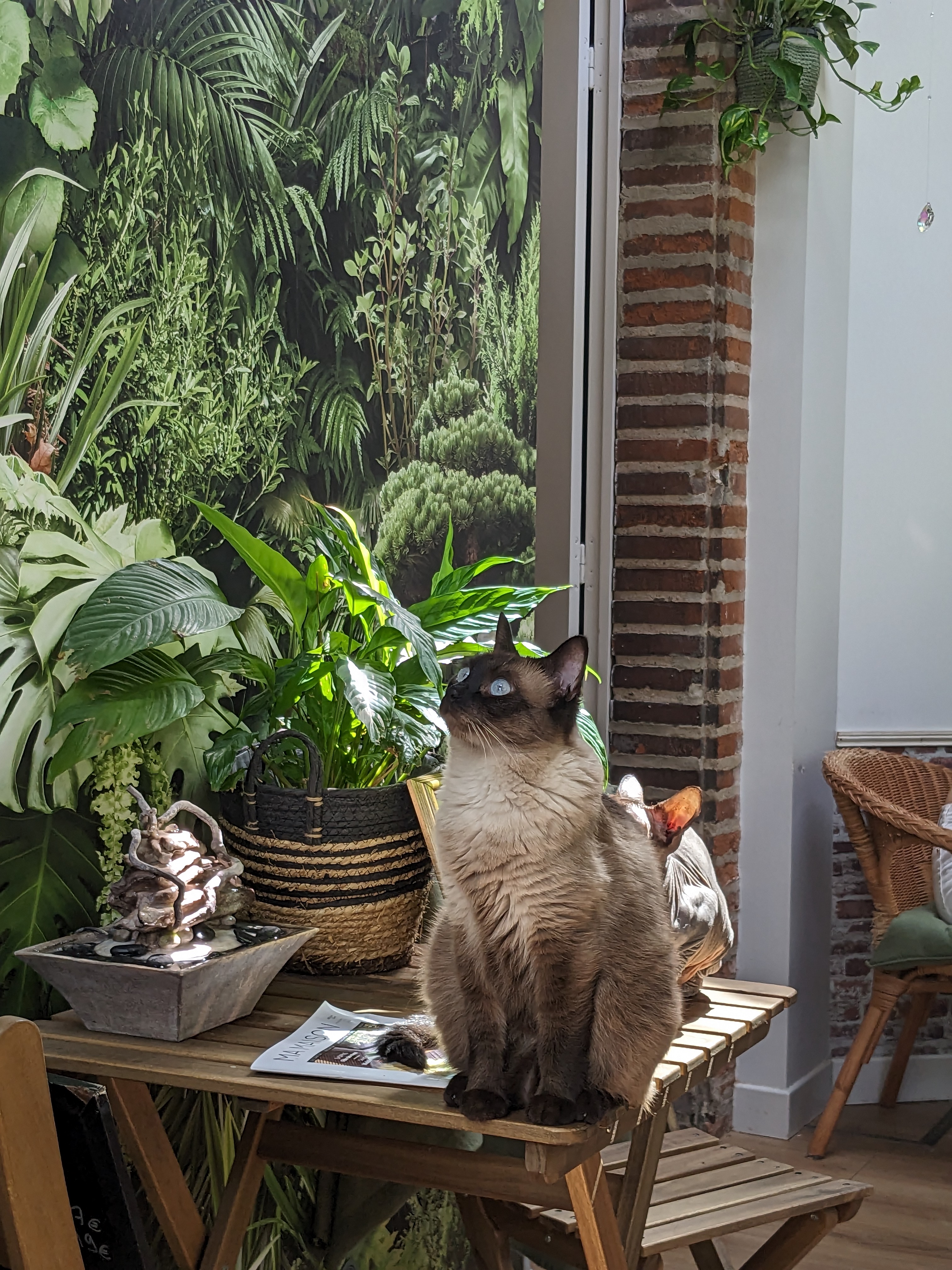 Découverte de ce lieu si chaleureux et apaisant. Un thé glacé accompagné d’un cookie dans la véranda avec vue sur le jardin incroyable. Les chats sont tous beaux, joueurs et câlins ❤️ La décoration est sublime. Nous avons échangé avec la propriétaire des lieux qui est très douce et très gentille. Je recommande +++ Roxi et Marinette.