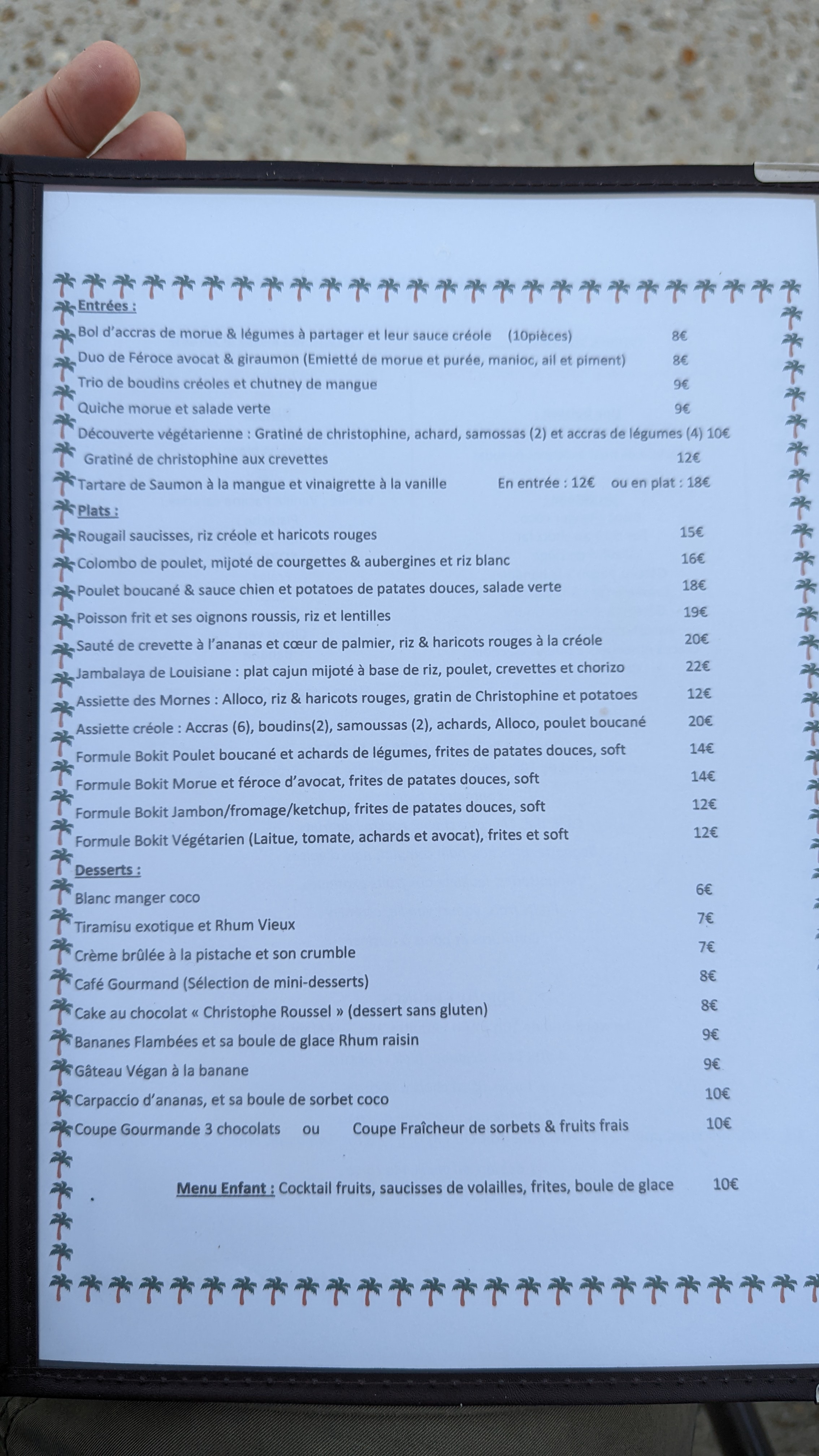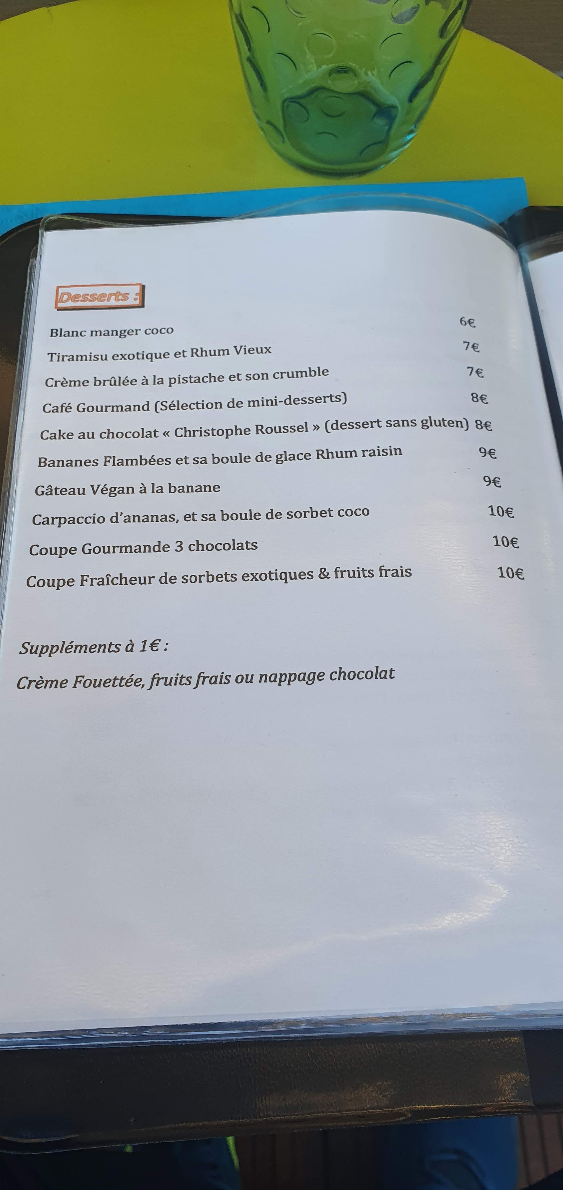 Une belle découverte, sur réservation. Attention très difficile pour ce garer. Une ambiance plutôt cocooning que tropical, un restaurant assez petit. Une cuisine bonne , mais dommage que les desserts ne soit pas plus exotiques à part 2 . La pâte du bokit trop cuite. J aurai aimer voir des cocktails exotiques sans alcool. Les toilettes, les serviettes pour s essuyer les mains à mettre par terre ( prévoir une panière de linge). Un personnel très accueillant, professionnel. Bravo à vous