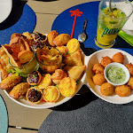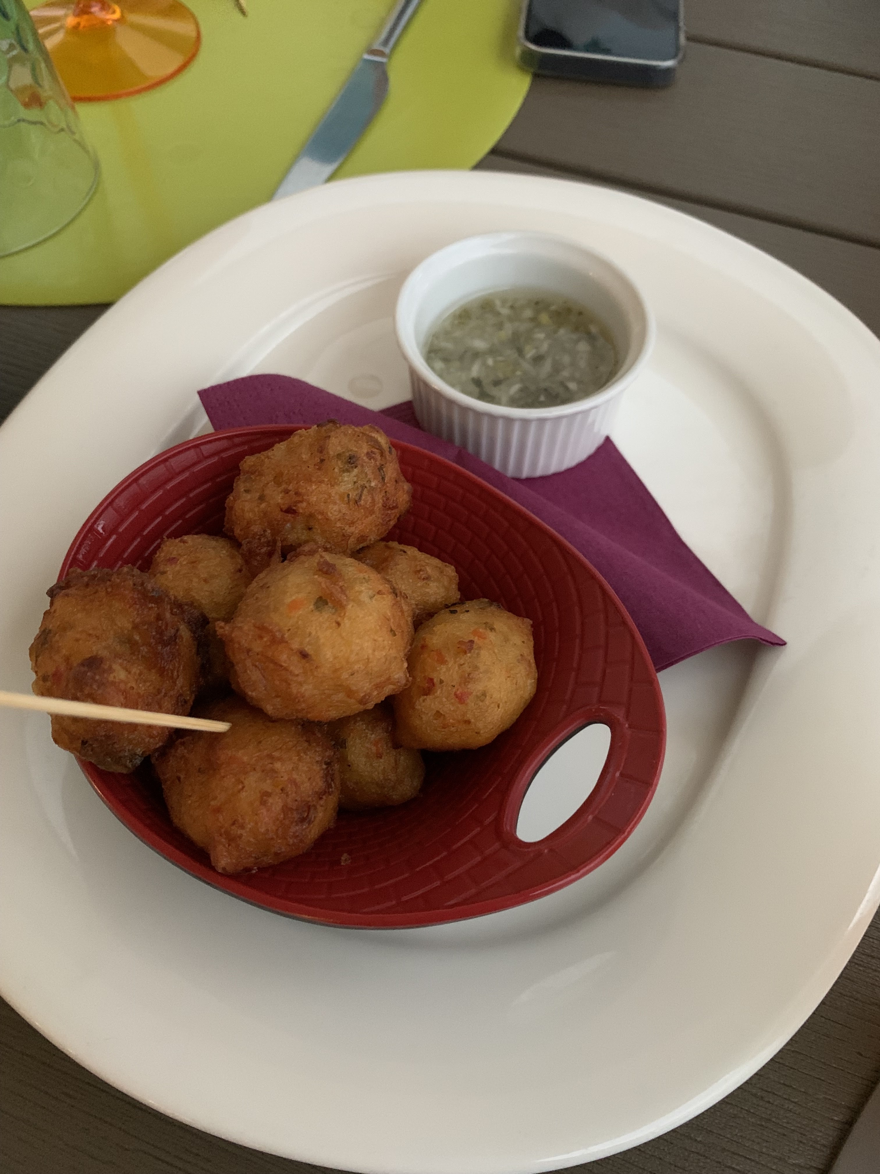 Avions réservé, étions sur le pont près de l'eau. Avons pris avec les boissons appéritives un plat dégustation qui était plutôt pas mal. Le boudin blanc au crabe bof à revoir. J'ai beaucoup aimé les frites de patates douces mais pas trop le poulet boucané qui à mon goût n'avait pas plus de saveur qu'un simple poulet à la maison. J'y retournerai pour goûter autre chose.
