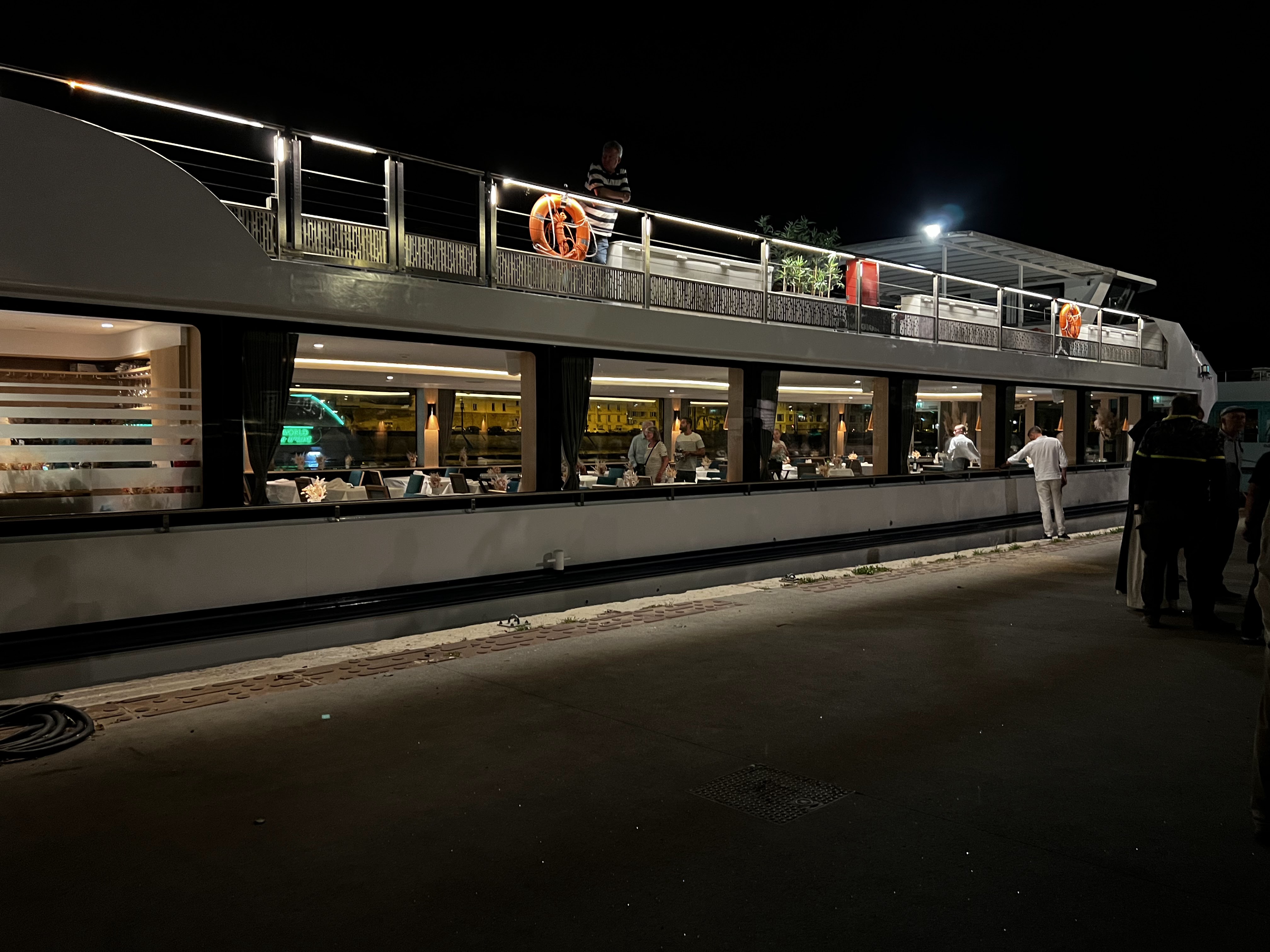 Une expérience unique. Naviguer sur la Saône et le Rhône de nuit tout en dégustant un excellent repas. Bravo aux serveurs pour l'efficacité et au chef pour la qualité des plats. Juste une température de salle un peu fraîche.