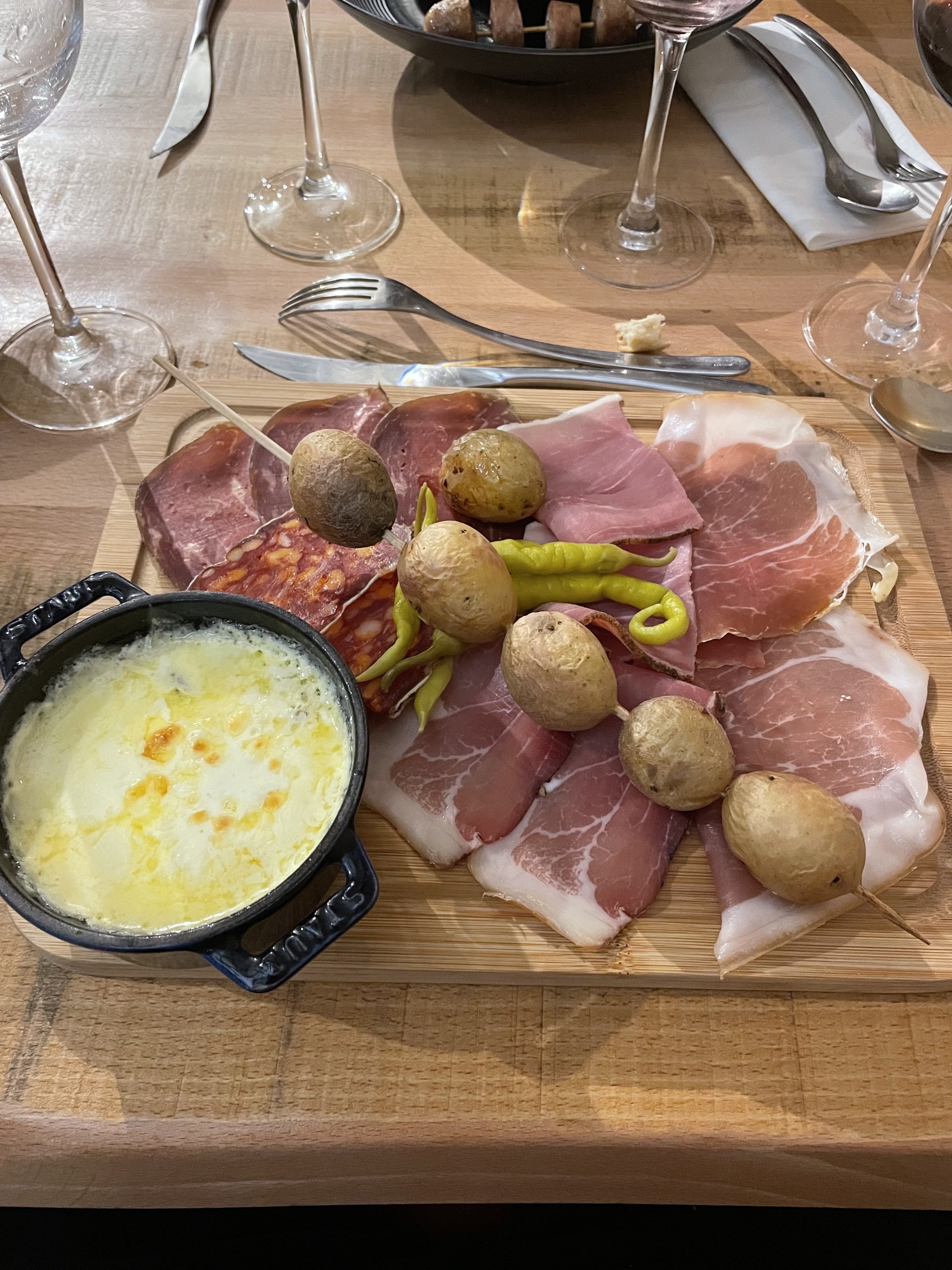 Première fois chez vous et nous avons adoré. La formule petit mont d'or et caverne pour deux était parfaite: un peu de charcuterie pour varier, et encore, je me demande si c'était nécessaire au vu de la diversité des fromages. Pour sûr, nous reviendrons!