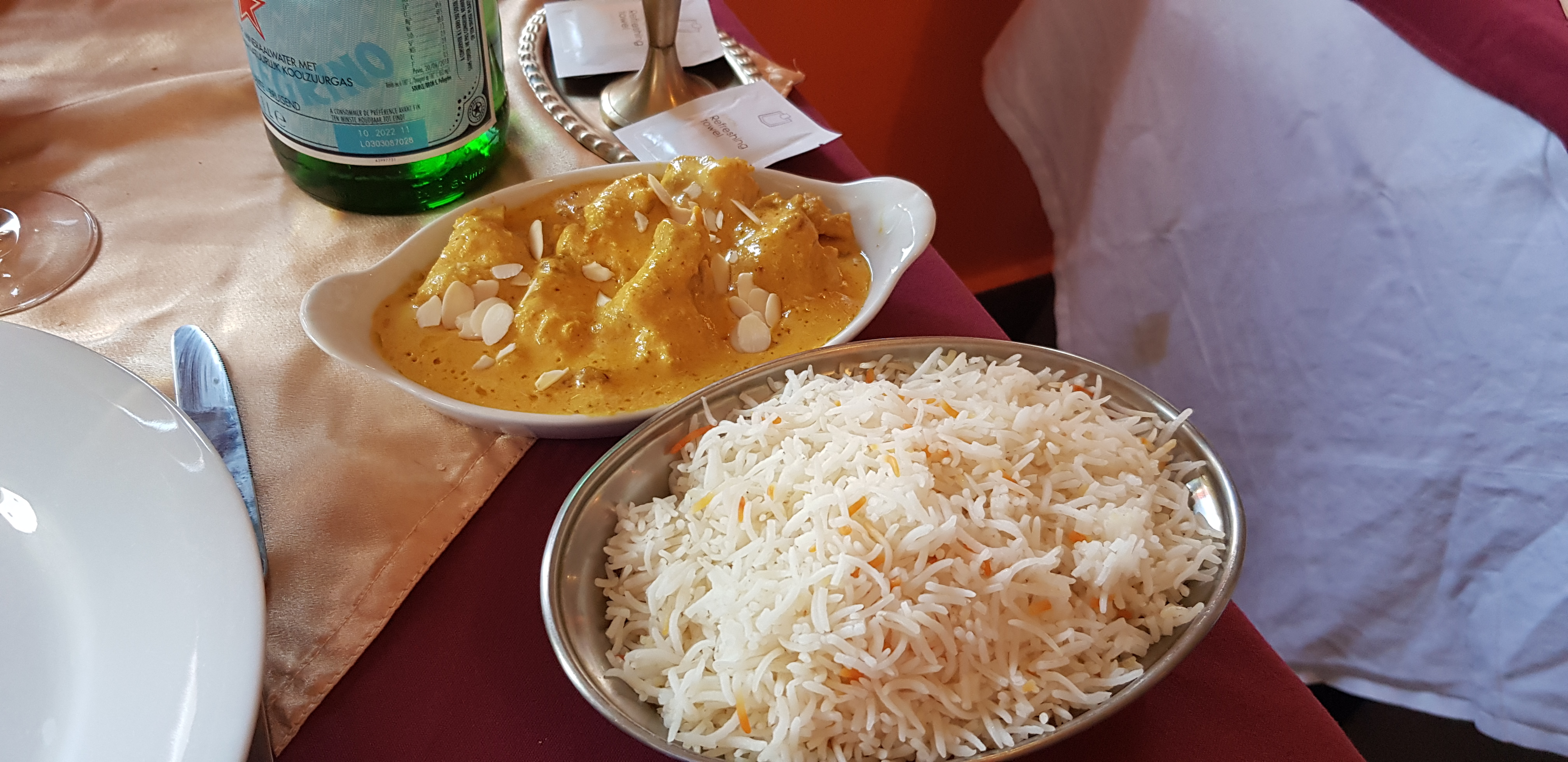 On s'est fié aux commentaires pour notre repas en amoureux. Tout est en supplément (riz comme accompagnement principal , pain, naan...) Nous avions demandé une bouteille d EVIAN.. 6€!!!!! Le naan à 4€ ! ! Pas mauvais, pas incroyable non plus. On connu bien mieux en cuisine indienne. Pas sûrs d'y retourner...