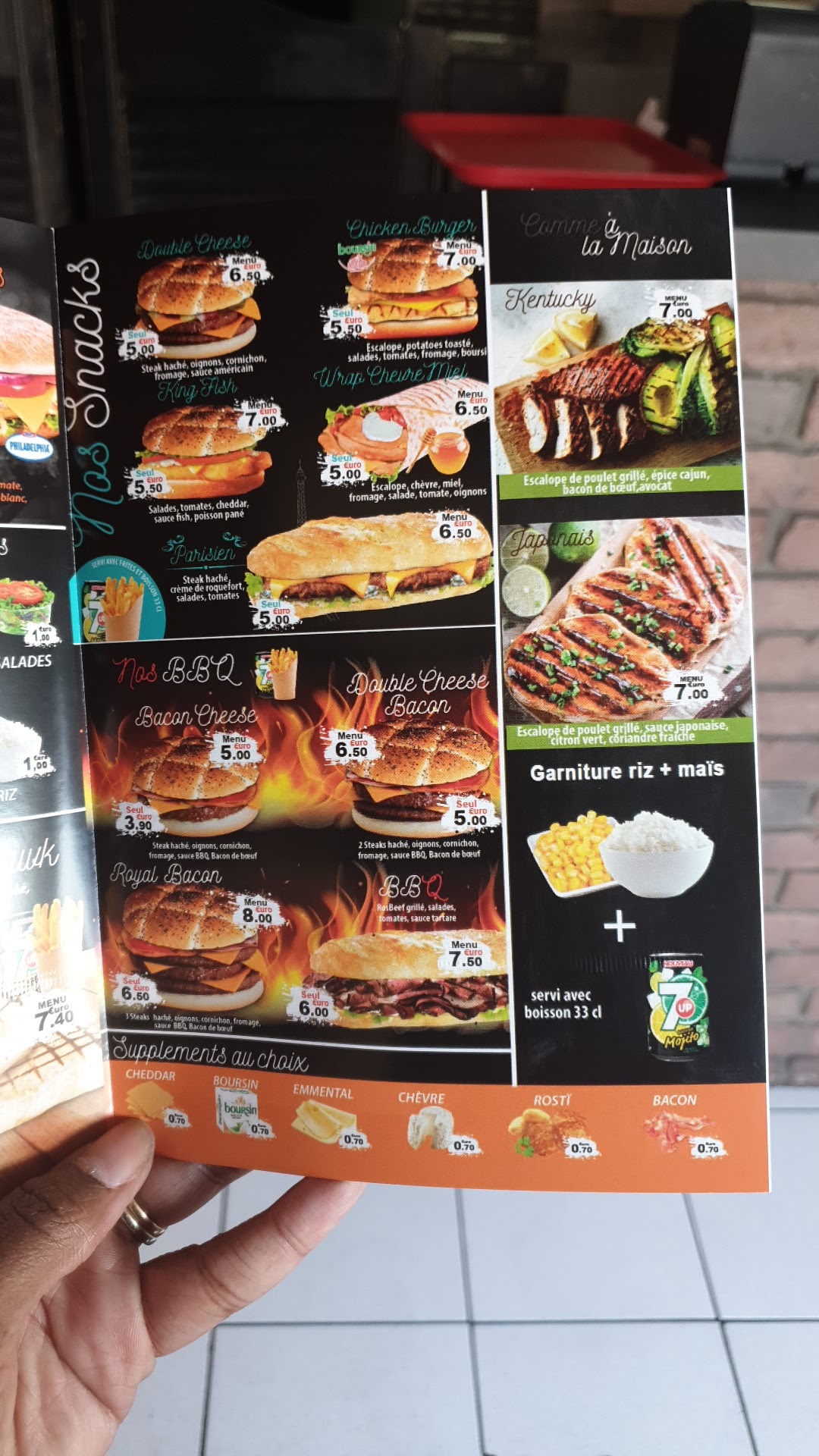 Service très rapide et une carte riche (burger, kebab, poulet frit, nuggets) !