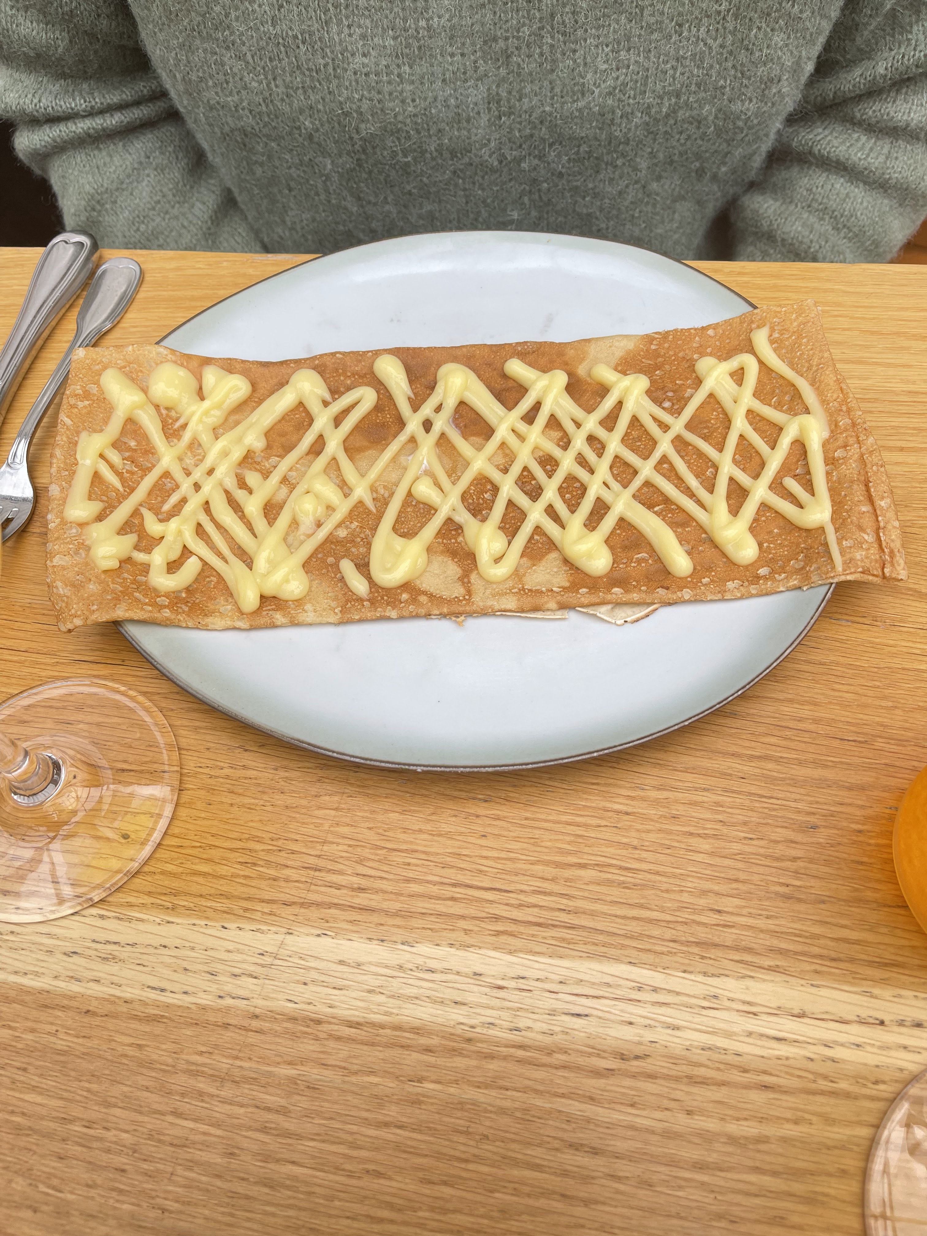 De passage rapide pour mon travail je suis venue déjeuner avec mes collègues, service soigné et rapide. La galette était délicieuse, croustillante (il y a un nom spécifique mais j’ai oublié), la crêpe sucrée aussi Je recommande !