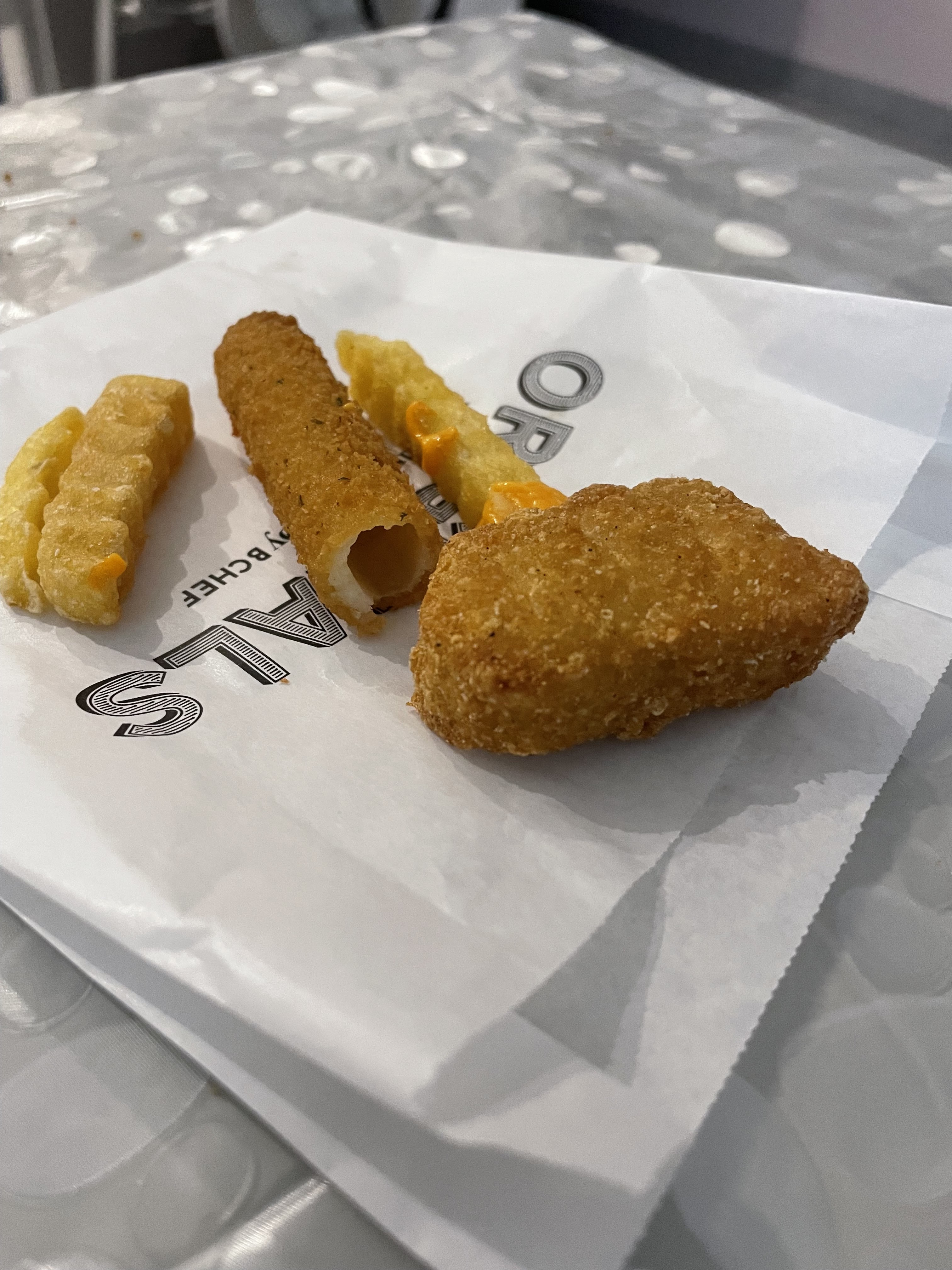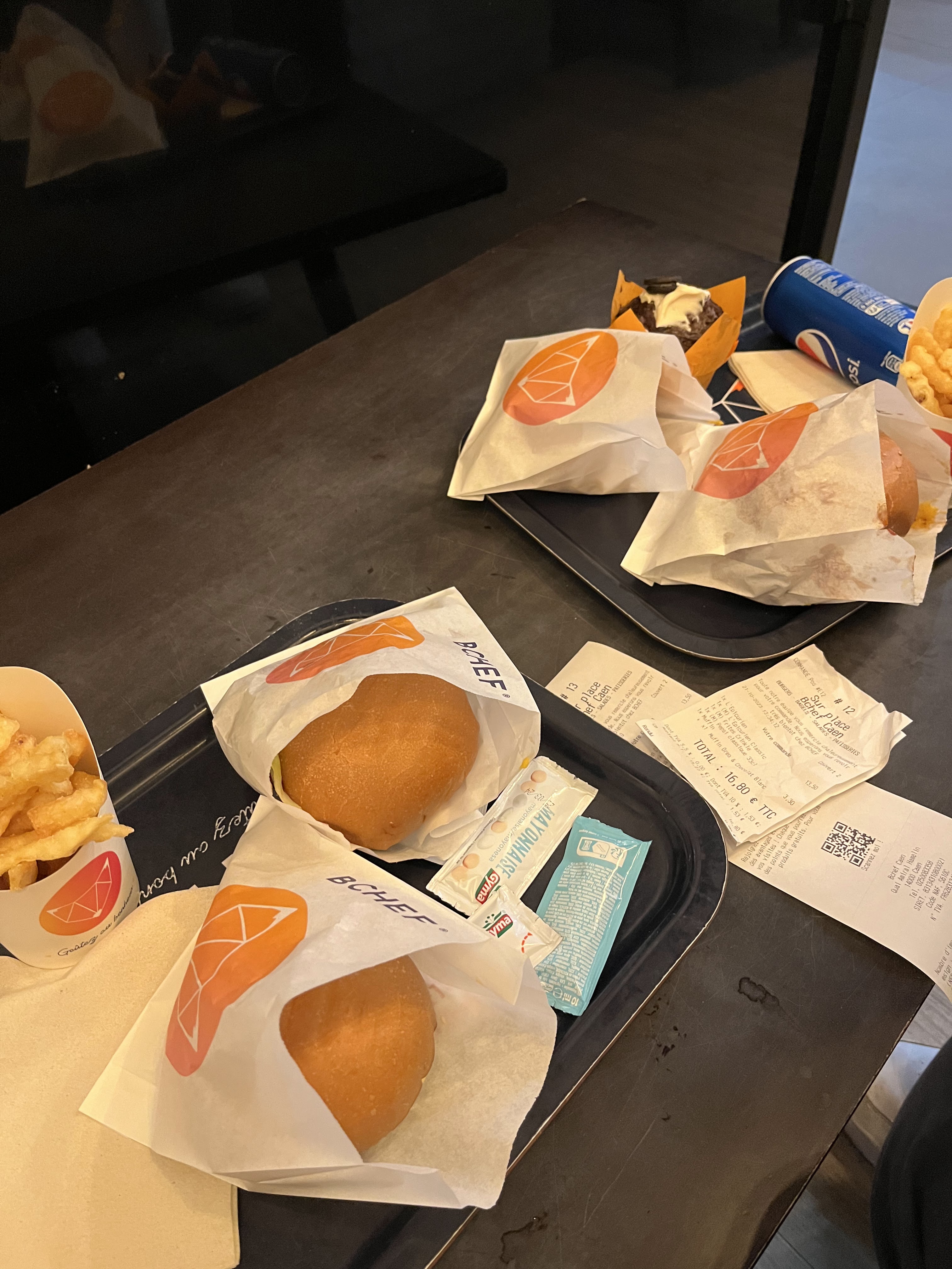 Une frite oubliée dans la commande. Des burgers pas vraiment garnis, steack haché petit et sans goût, le fromage a aucun goût non plus, une feuille de salade ridicule dans le burger. Et le hotdog et ourdé de sauce. Pour le prix, franchement déçu.