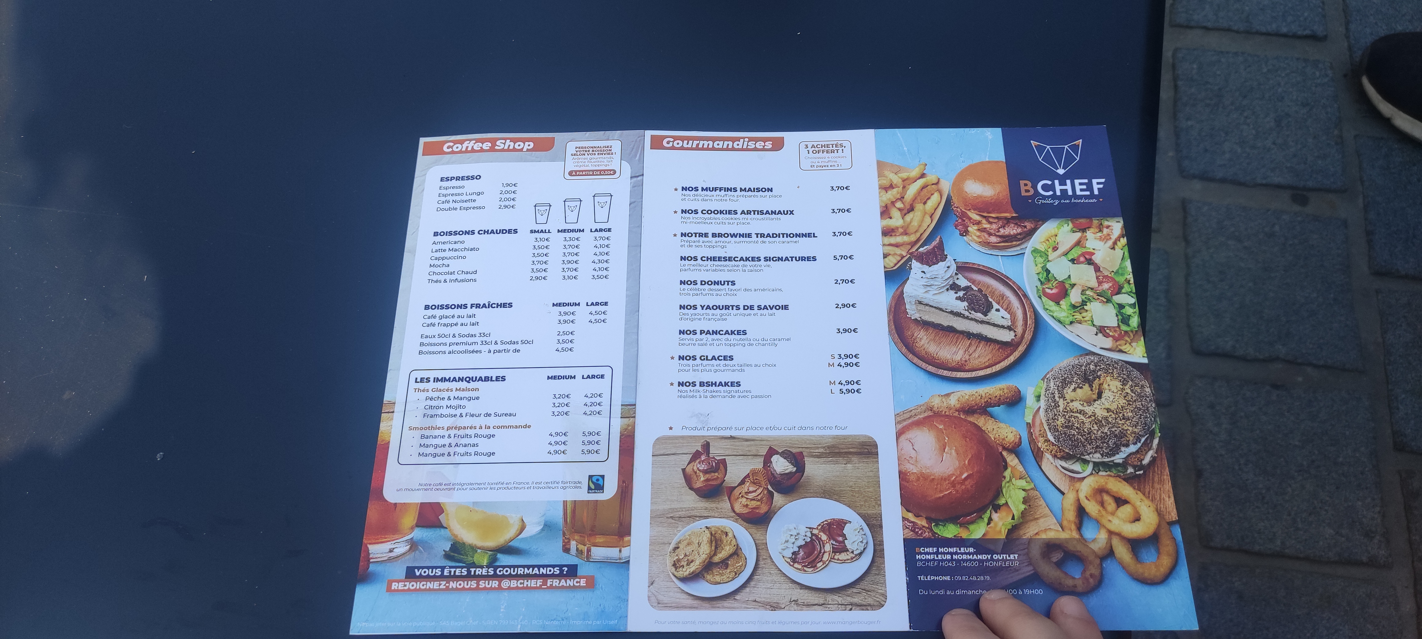 Nous ne connaissions absolument pas B CHEF, nous avons tenté & nous avons bien fait !!! Accueil : aimable et sympathique * Les frites: chaudes, croustillantes à l'extérieur et bien moelleuses à l'intérieur. * Hamburger Signature : très bon & copieux * Bagel Pin up: Supers ingrédients (saumon fumé, avocat...), on aurait juste aimé que nos sandwichs soient plus frais, en température ! * Cookies : Délicieux Nous nous sommes régalés lol Nous reviendrons c'est certain lors de notre prochain passage à Honfleur 😉