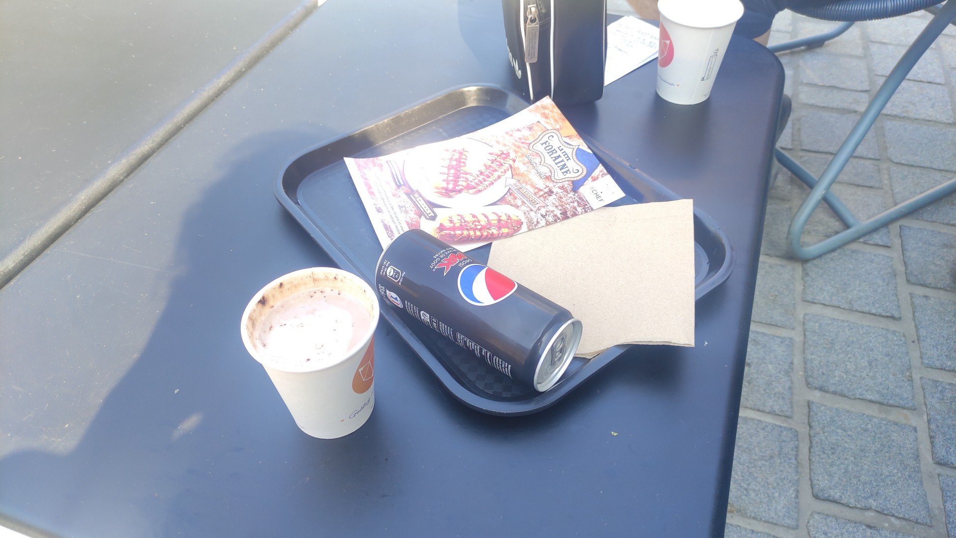 Dommage qu il y ait du café moulu au fond du gobelet. Les chaises sont mouillés , on ne peut donc pas prendre un café en terrasse.