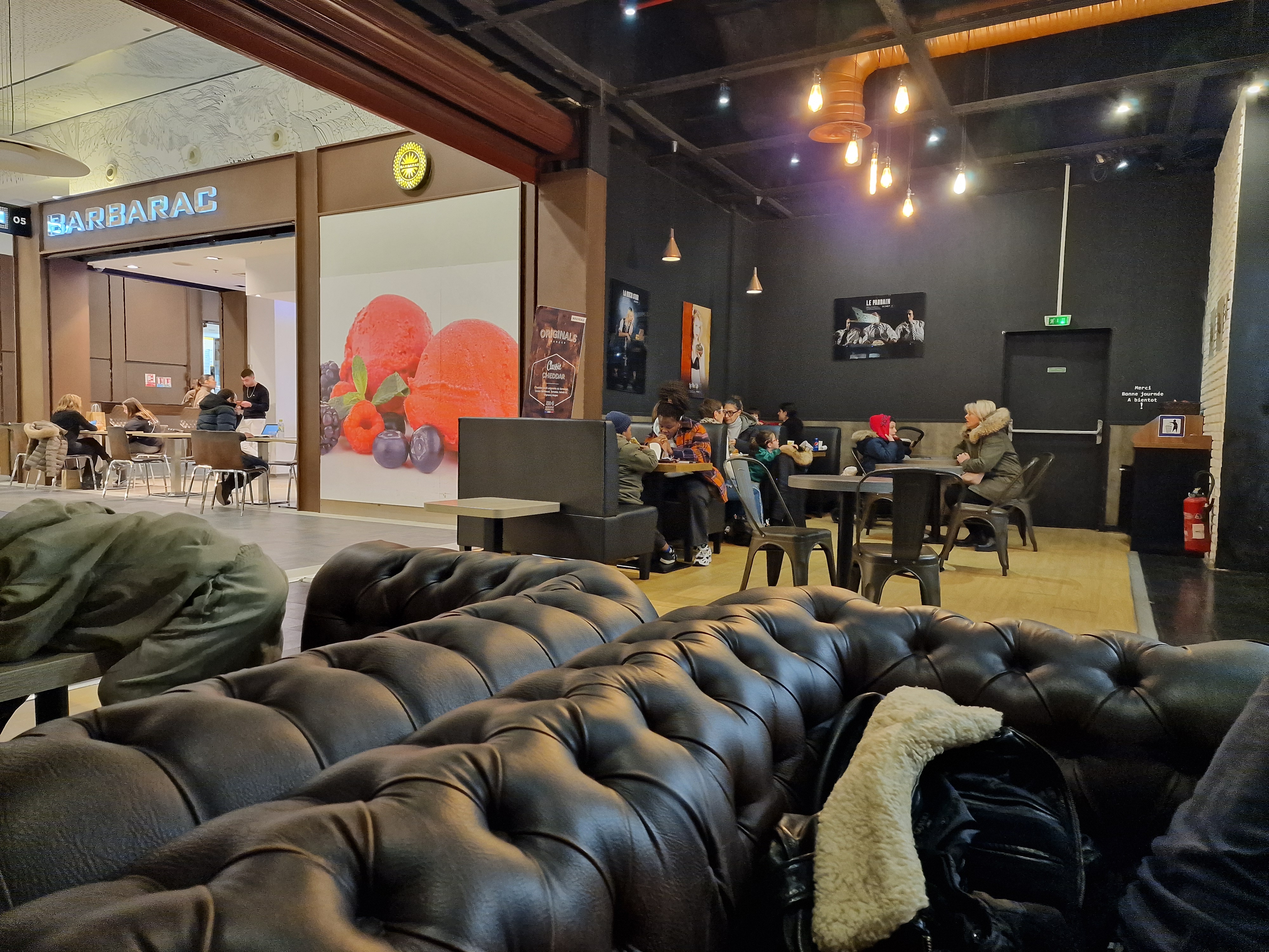 Resto sympa, type fast-food. Les grands canapés sont confortables. Menu enfant disponible. Mais pas de chaise haute. Service avec biper pour manger sur place.