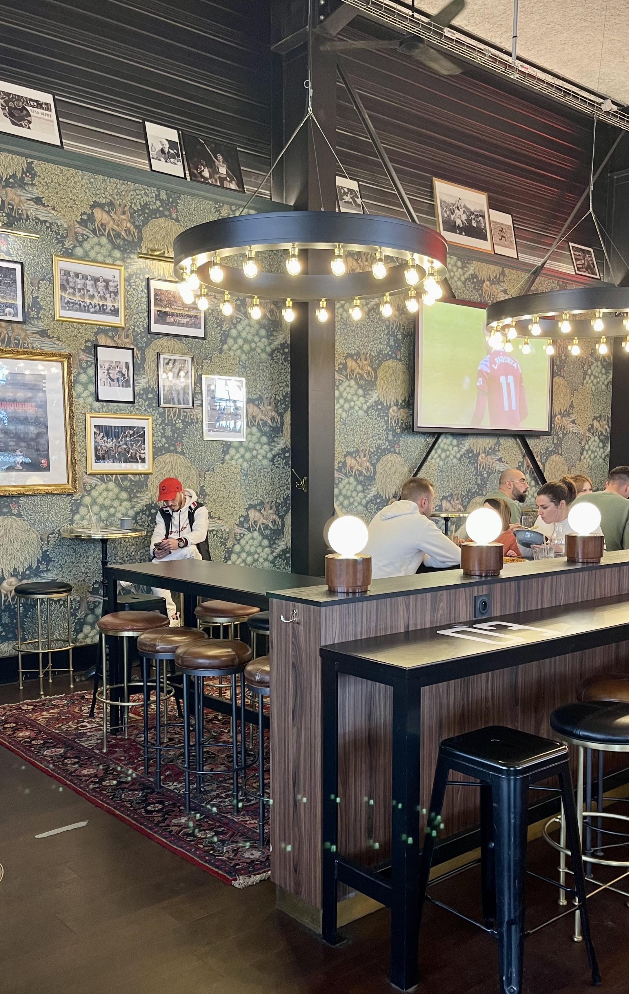 Lieu très intéressant et vaste pour partager des matchs sur grands écrans (pas que du stade rennais !) avec tables et banquettes et un coin canapés. Commande au bar avec bipper ou sur téléphone portable avec paiement en ligne. Assez efficace. Service très courtois et dynamique. Bons plats - entrées, pizzas, burgers...