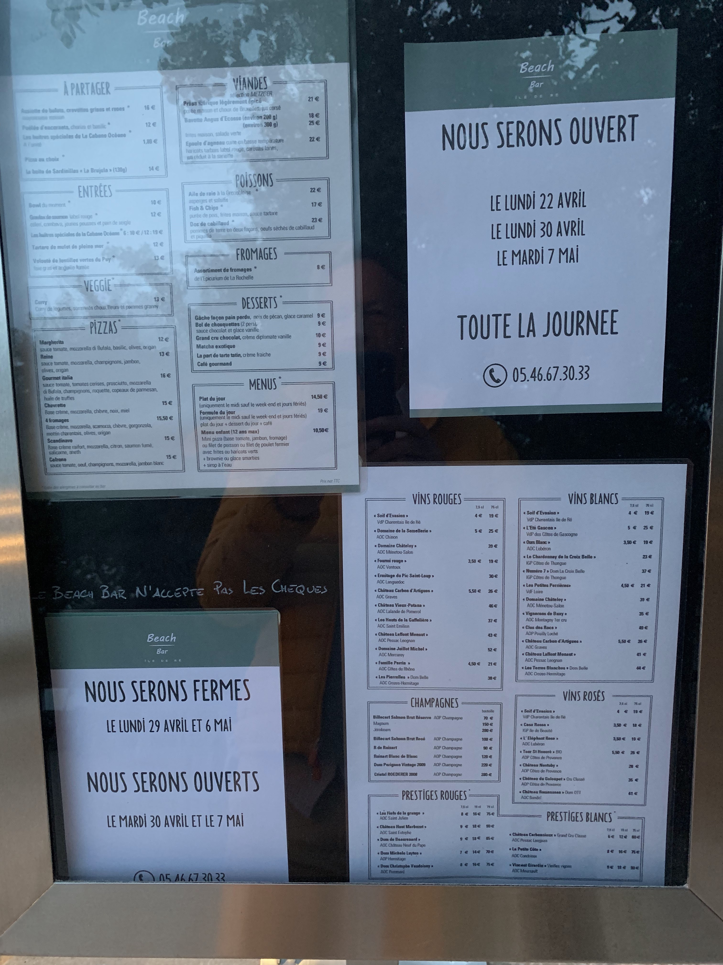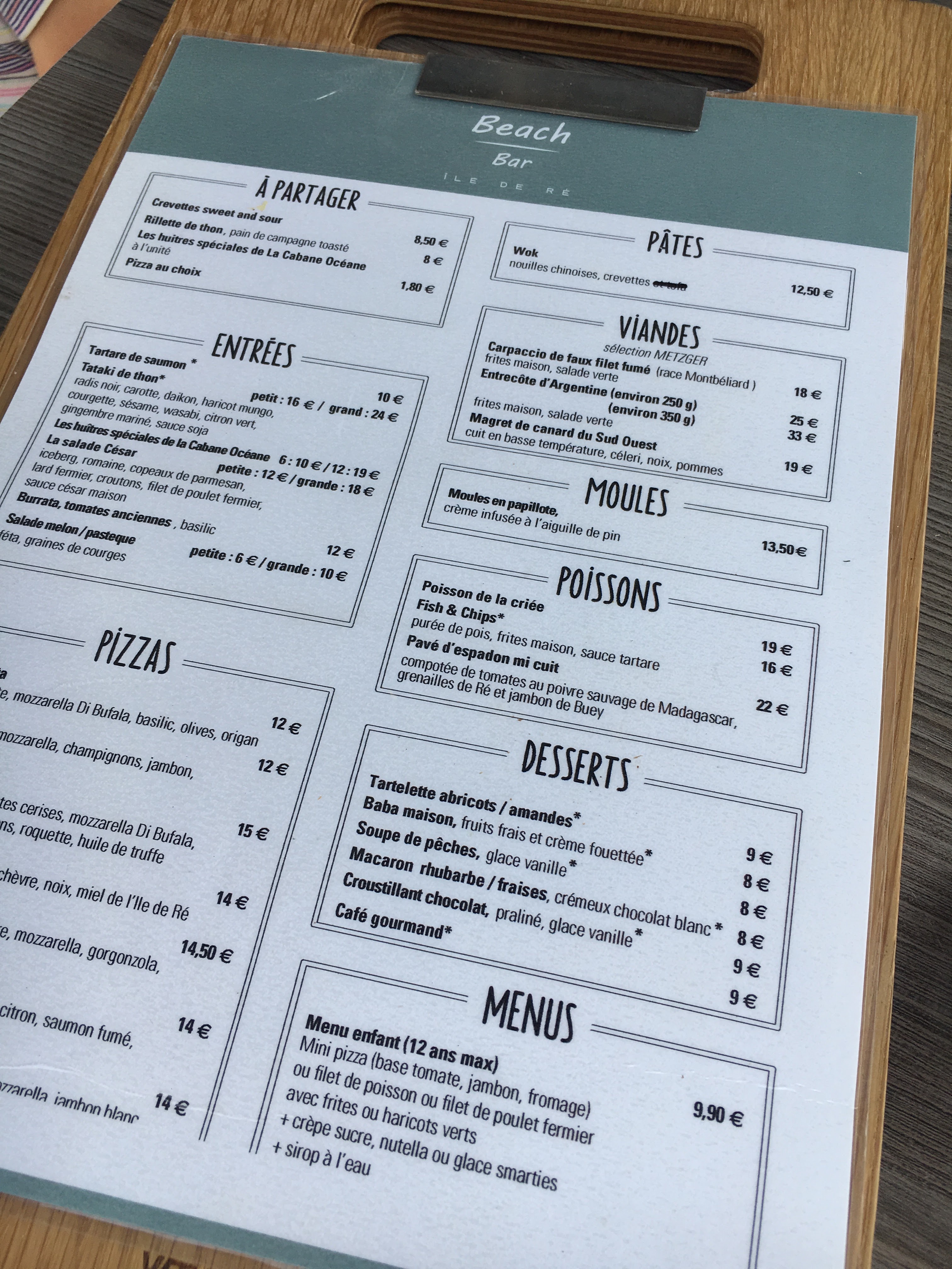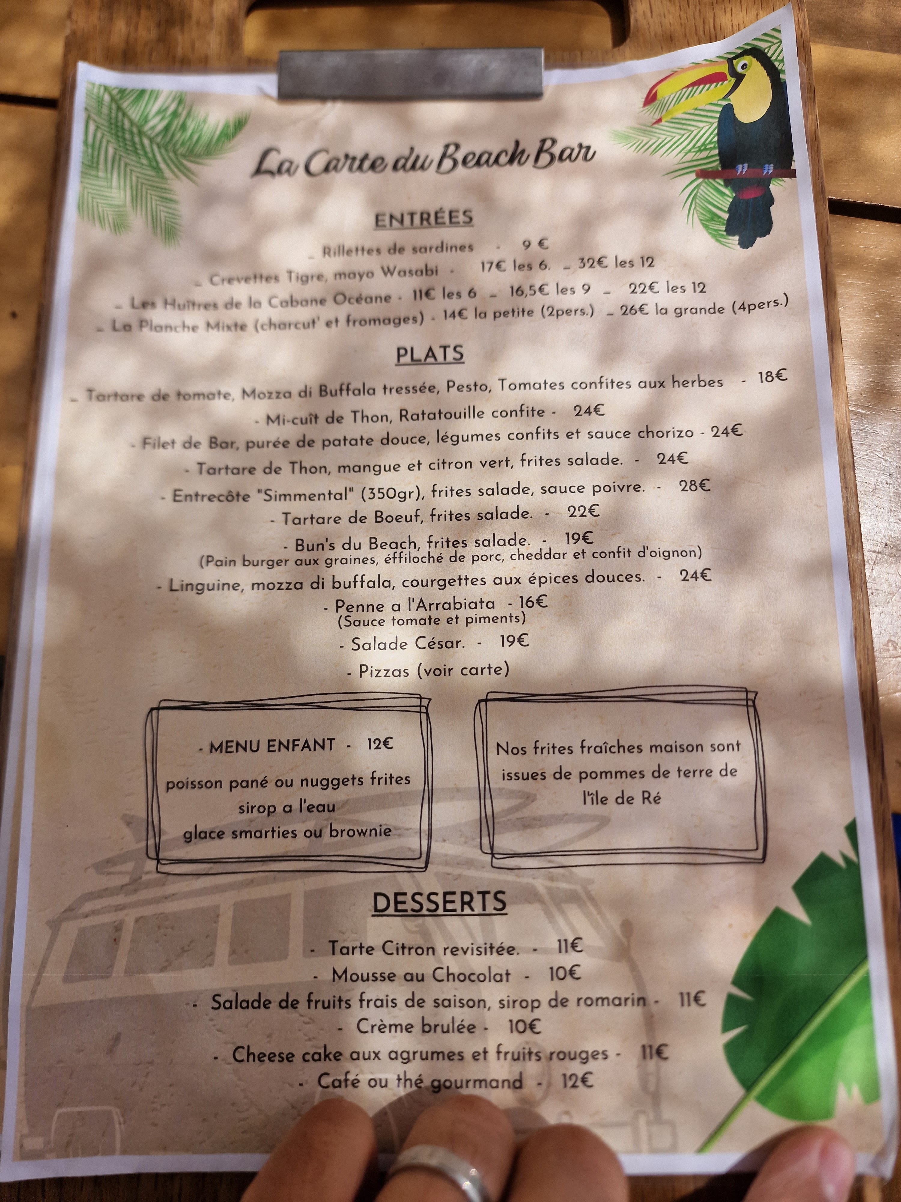 Quelques couacs, mais c'est le début de la saison, et c'était clairement blindé ce samedi de l'Ascension. Ils sont largement compensés par la sympathie des serveurs / serveuses et la qualité du repas. Tout est bon et fait maison de l'entrée au dessert. Les cocktails sont également au top. Enfants bienvenus. Intérieur / terrasse couverte / terrasse découverte pieds dans le sable. Musique d'ambiance sympa. Réservation conseillée en saison. À recommander aussi bien pour boire un verre que pour déjeuner / dîner. Nous reviendrons avec plaisir. Valeur sûre sur l'île de Ré, merci !