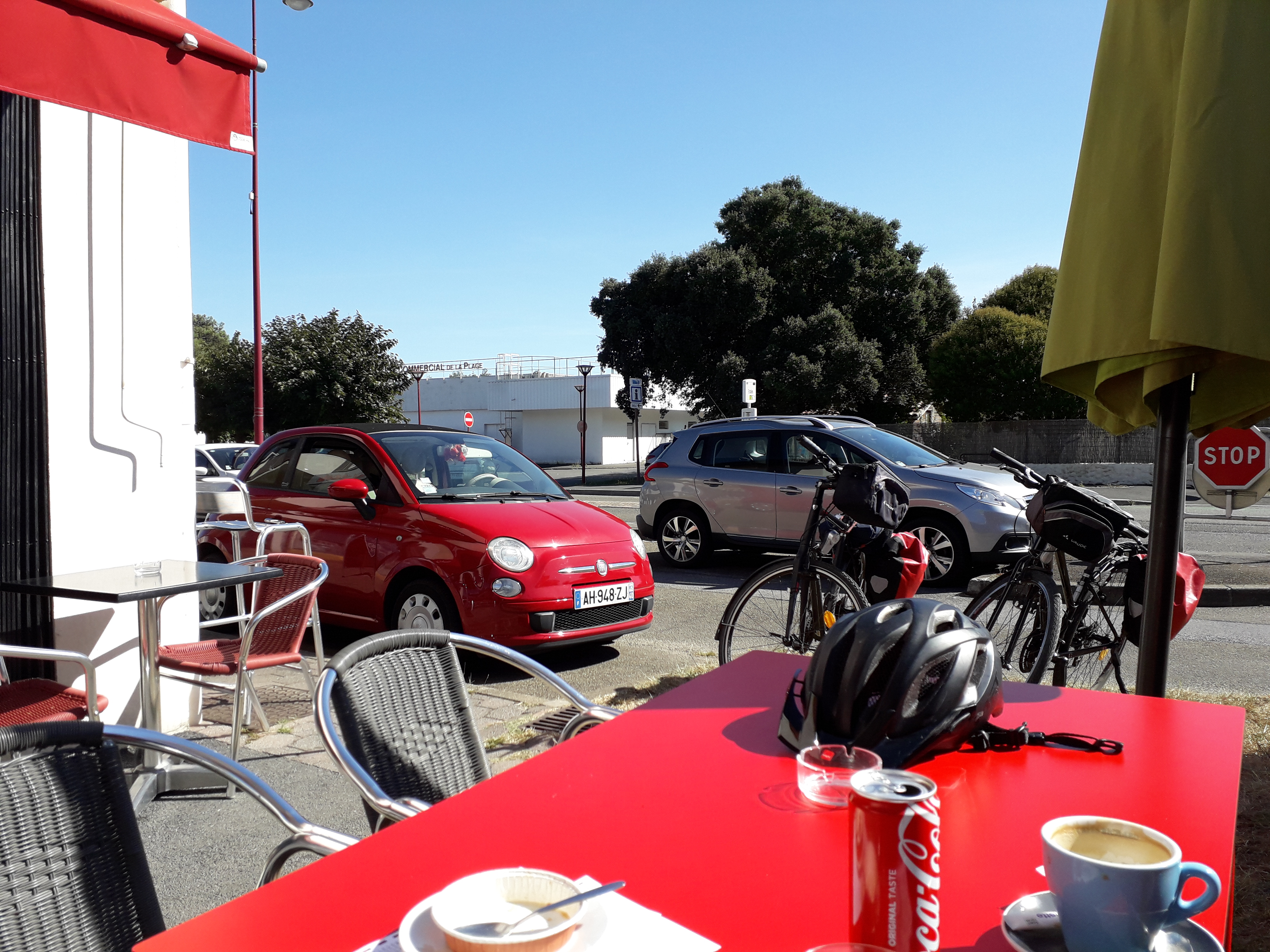 La vue depuis la petite terrasse entre le café, une palissade et la rue en face d'un centre commercial n'est pas vraiment édifiante. Mais le reste va bien ! Vous n'imaginez pas les délicieux desserts que les aubergistes concoctent dans la petite cuisine. Nous avons vraiment apprécié le crumble !