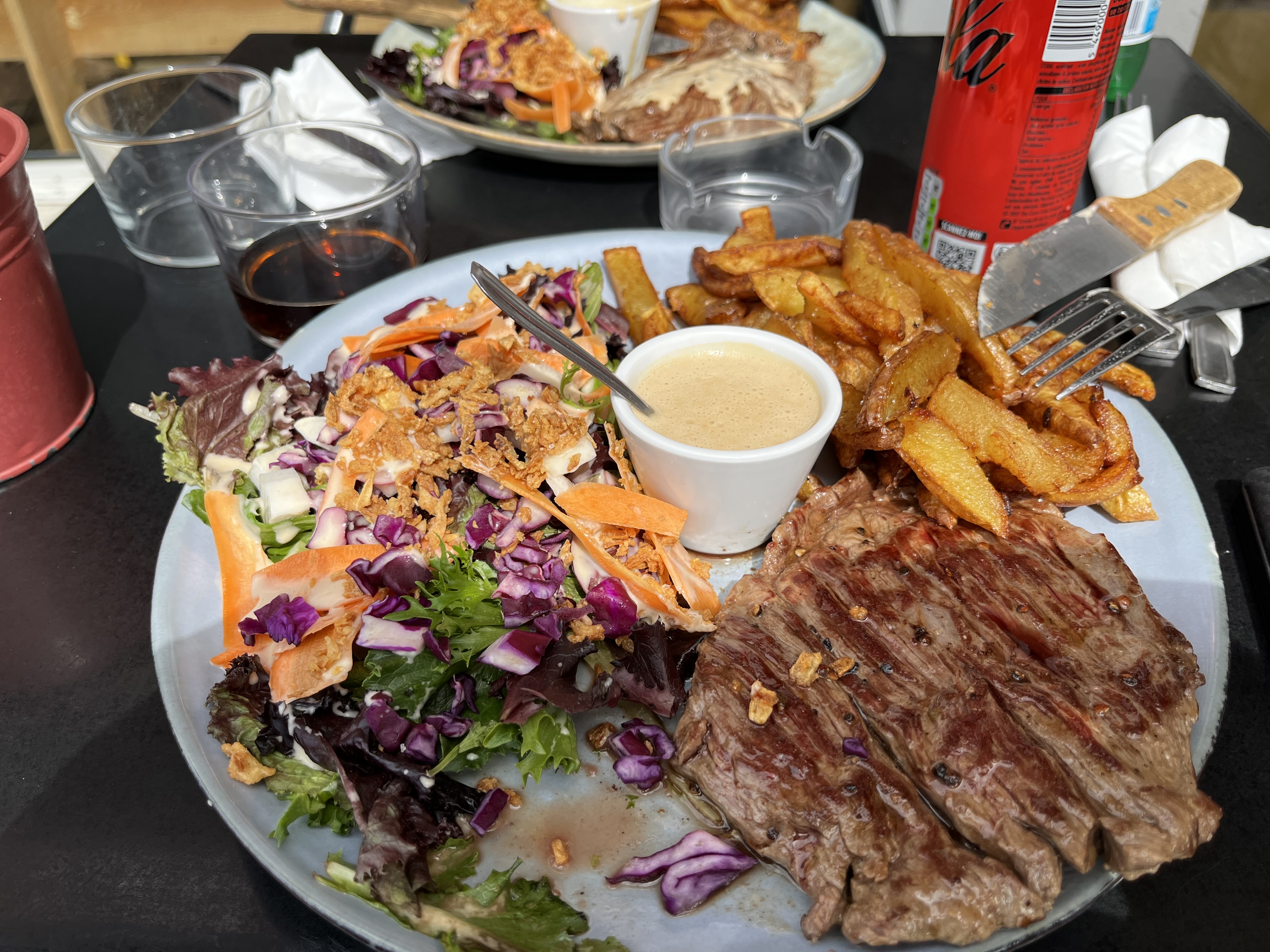 On débarque à 13h30 à 5 est ce possible de manger? Un grand OUI avec le sourire malgré le rush du moment! On s installe a l exterieur, ambiance décontractée entre pause de midi pour les travailleurs, les habitués et nous😁On commande au bar : 2 bacon cheese burger, 2 bavettes et un lomo œuf! Bilan à réception des plats : assiettes copieuses,bavettes bleues cuites à la perfection, frites maison que du bonheur, lomo oeuf parfait et les burger « une vraie dinguerie » dixit Noah 13 ans!Produits de qualité et frais avec le tour de main et le savoir faire et être d une petite équipe au top 👌 merci de nous avons régalé ce midi 😉 a très vite!