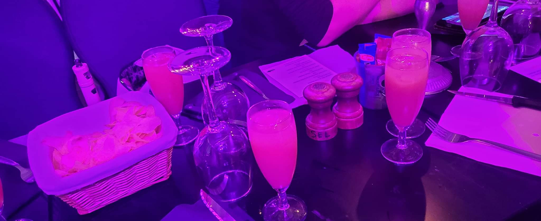 Nous sommes venus pour un anniversaire. Nous sommes passés à table quand cela nous a été demandé. Arrivée à table, une serveuse très autoritaire nous a demandé ce que nous souhaitions boir ou manger. Il fallait choisir vite car le chef se casse Nous avons eu les cocktails en même temps que les entrées. Et au comble du bonheur, le DJ a lancé la musique à fond et mis les fumigènes au moment de l'entrée. Nous sommes allés danser après l'entrée puisqu'il y avait de la musique mais nous sommes faits rattrapés par la patrouille !!! Aller à table pour le plat, demandé de manière très rude ! J'ai mangé le poisson et c'était très bon, filet de loup, ratatouille et écrasé de pommes de terre, enfin je crois car il n'y avait pas de lumière.... Certains qui ont mangé la viande, n'ont pas apprécié. Par ailleurs ils ont clairement un problème avec l'alcool, après quelques apéro, certains ont été interdits de boire alors que nous n'avions pas commencé l'entrée ! Indiquant qu'ils avaient vu aux caméras qui avaient bu. Des caméras ? Mais il n'y a aucune indication de caméras ! C'est clairement une atteinte à nos libertés ! Le DJ a néanmoins donné une super ambiance et nous nous sommes beaucoup amusés.