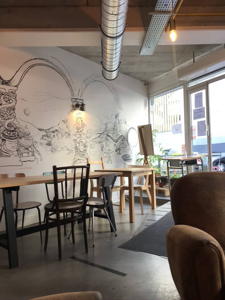 Un café super agréable et chaleureux Un peu déstructuré, où l'on peut travailler ou alors simplement passer un bon moment entre amis Je dirai juste qu’il manque une petite ambiance musicale