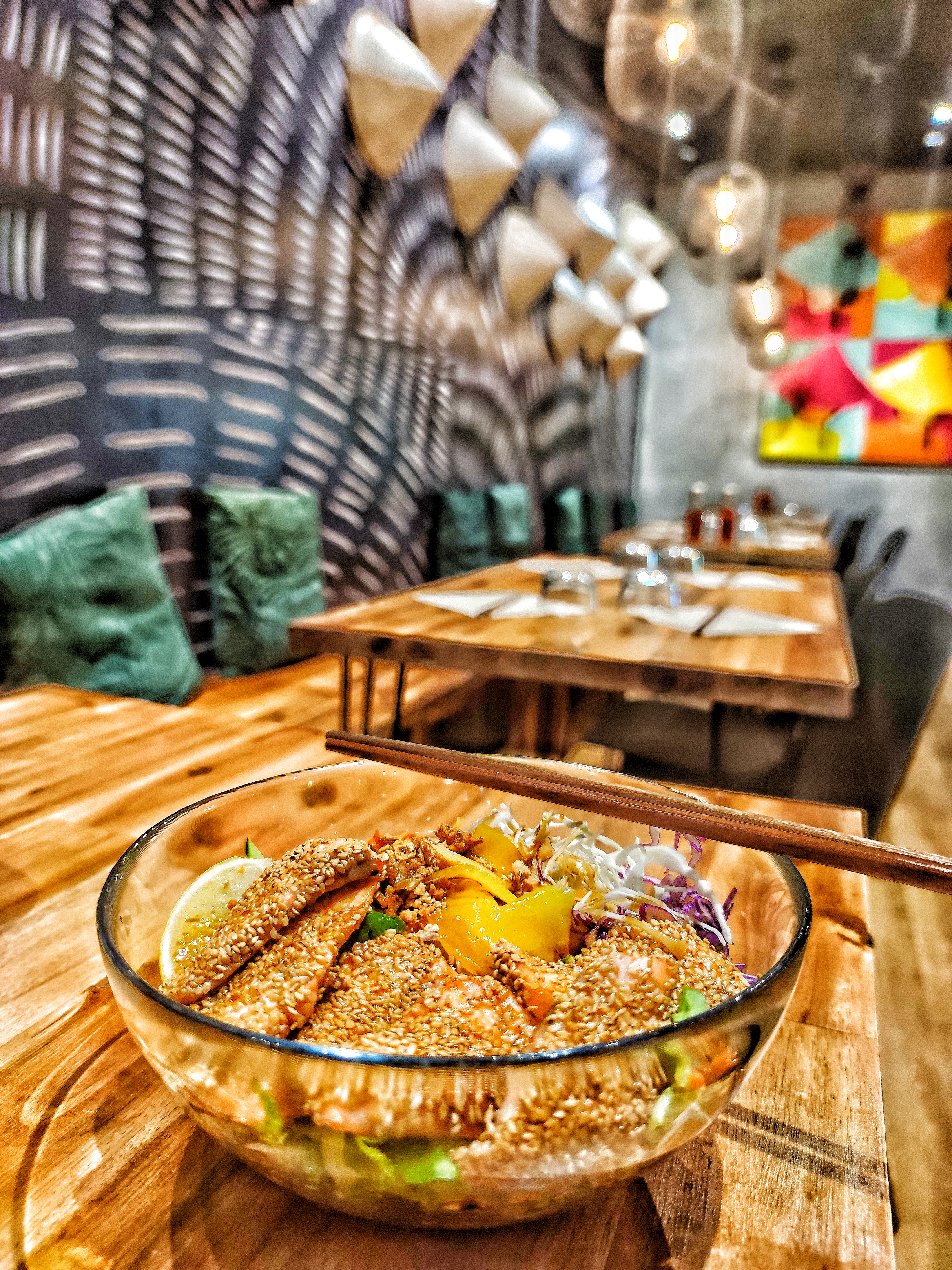 Le cadre est plutôt sympa avec une vaste terrasse à l'arrière. L'accueil est chaleureux La carte est reduite, je trouve ça aussi bien. Testé le bobun qui était pas trop mal, mais pas énorme et pas à tomber par terre. La hotte en cuisine est bruyante mais peu efficace : ça sent le graillon. Après m'être fait réchauffer les boules... coco, je peine à ouvrir l'emballage plastique. Un peu cheap.