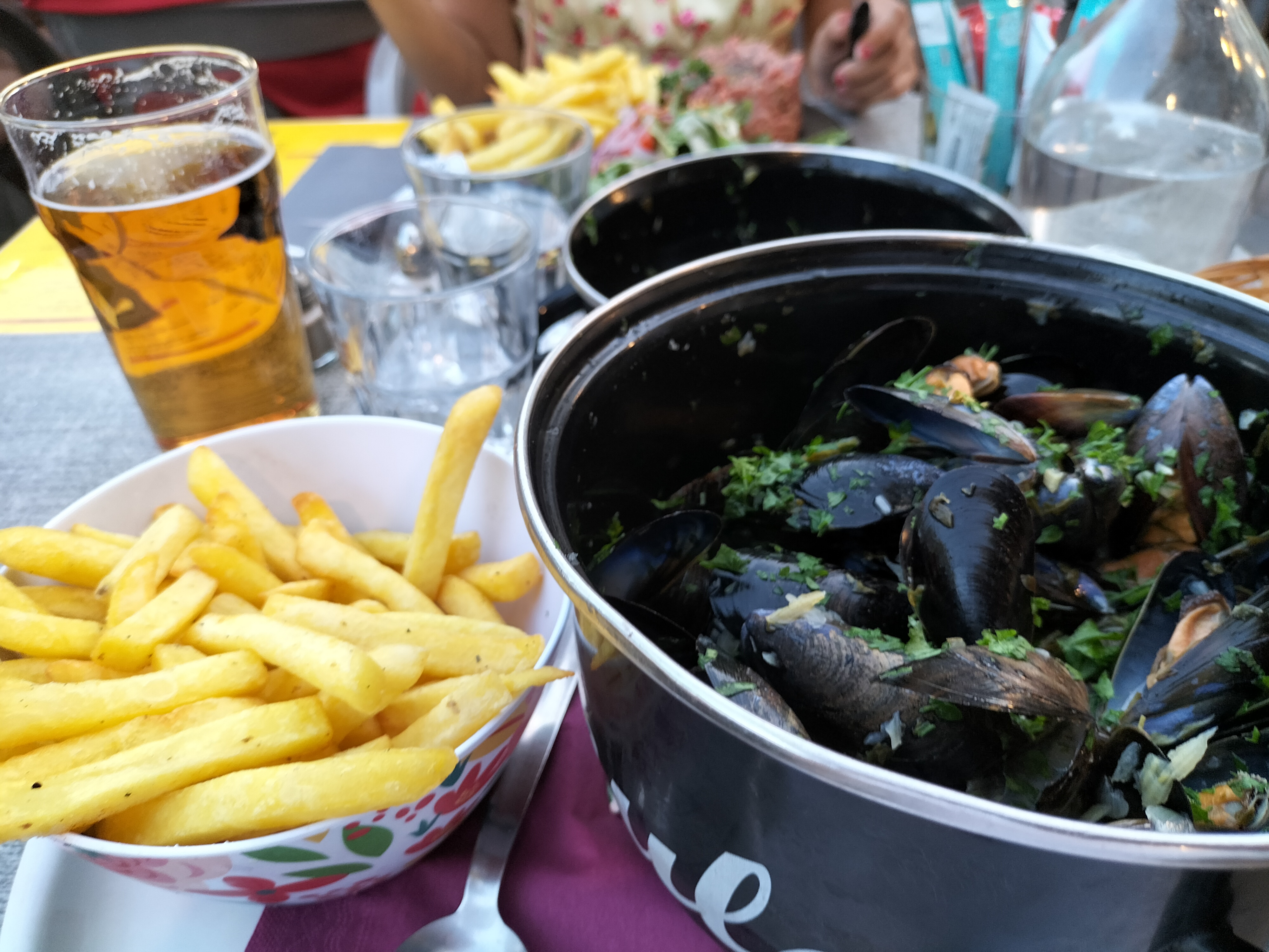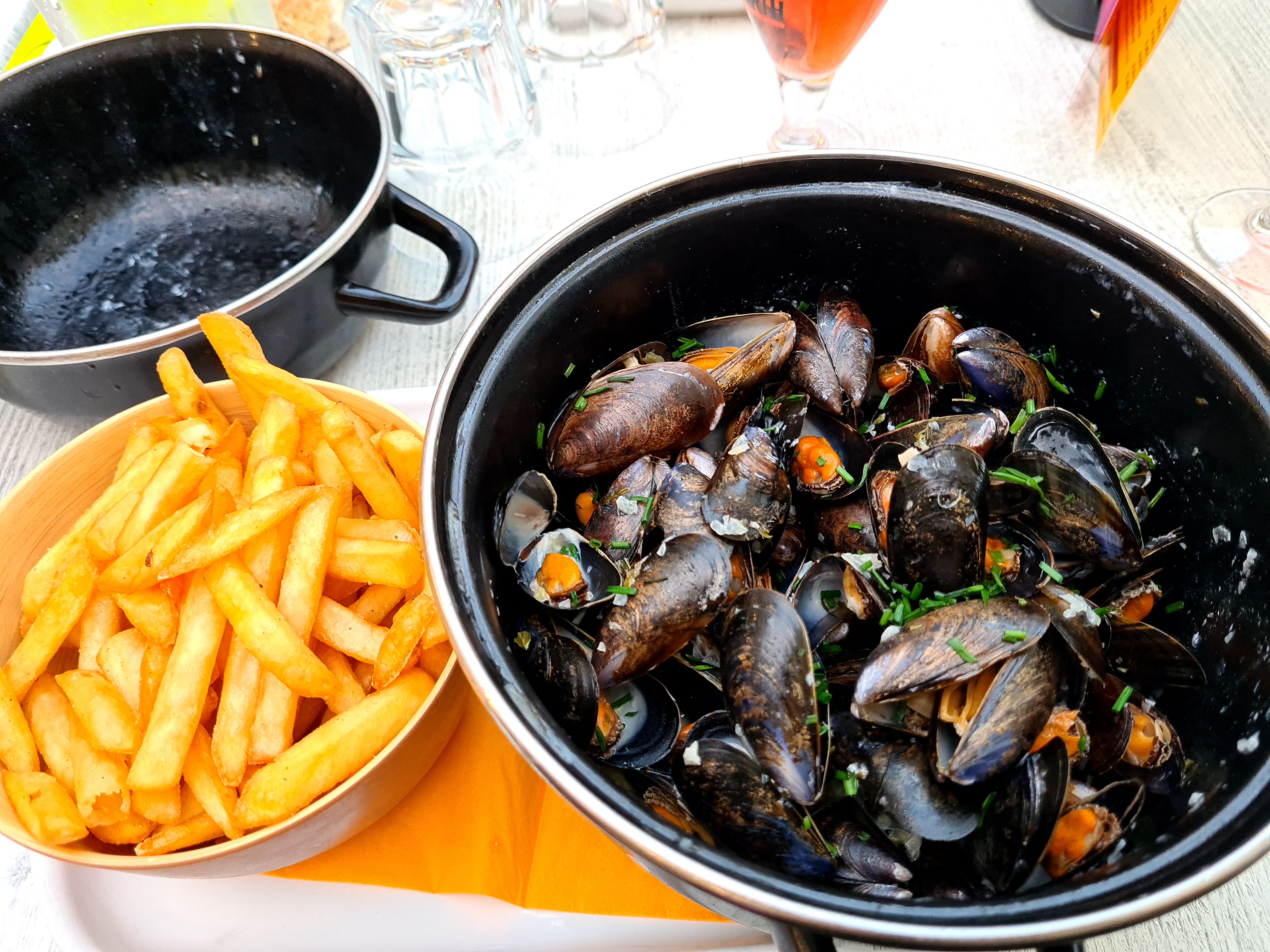 Jeudi soir, soirée moules. Bon repas. Pas trop cher. Vous êtes assis dehors.