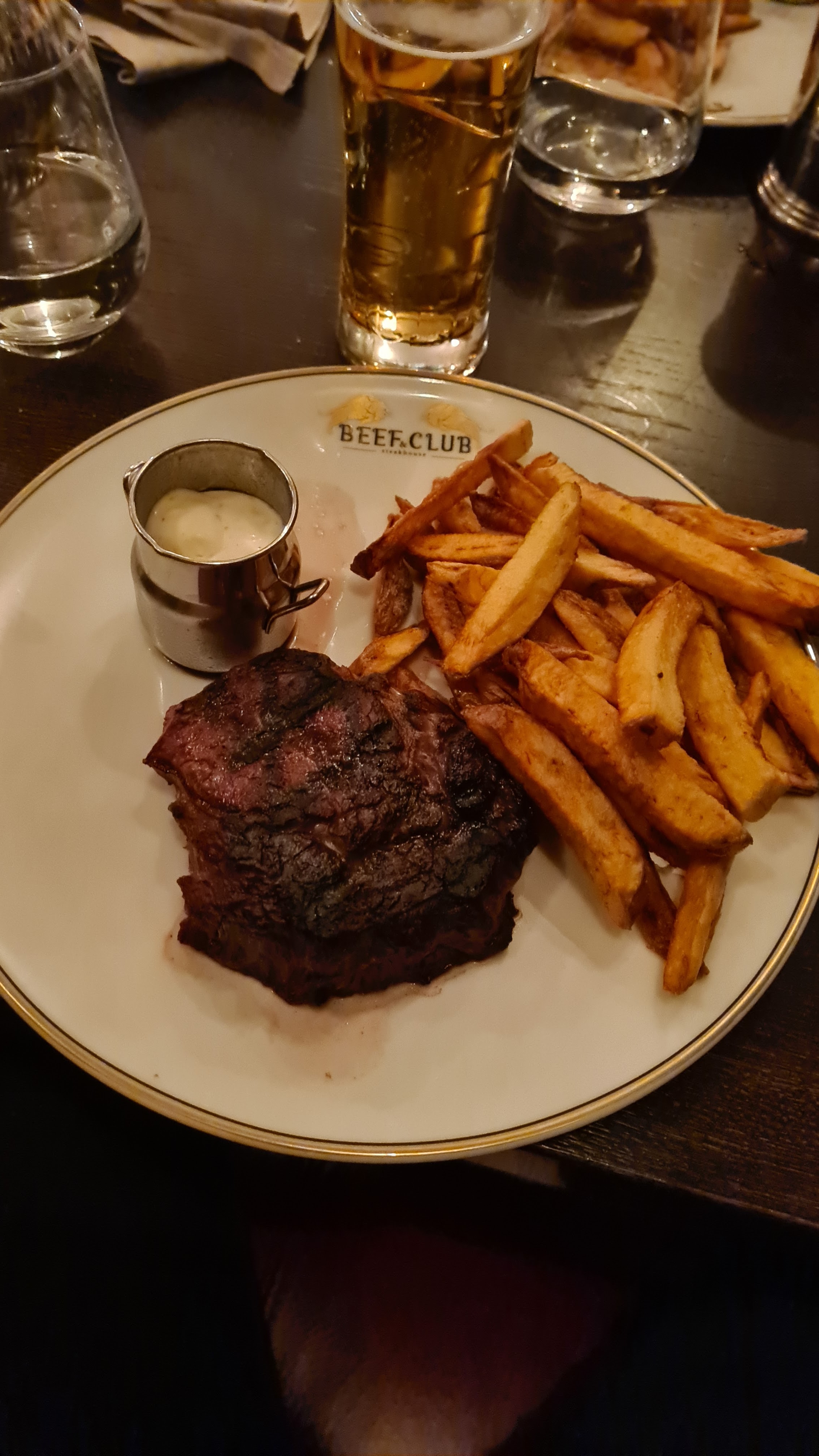 Super restaurant. Nous avons mangé l’entrée à la crevette, une cote de bœuf a partagé qui était très bonne et la cuisson était exactement comme nous le souhaitions. Les fromages étaient bon, mais rien d’exceptionnel. En dessert, la tarte aux pommes était vraiment très très bonne, une sacré réussite! Le service était irréprochable, le serveur était poli et disponible. Il y a un sommelier en salle pour vous aider à choisir le vin. Le pianiste donne une très belle ambiance pendant le repas! Le seul point « négatif » c’est le parking, malheureusement il n’y avait pas de place à notre arrivé mais quelques mètres plus loin il y a un autre parking. C’est un sans faute pour ce passage au beef club! Bravo