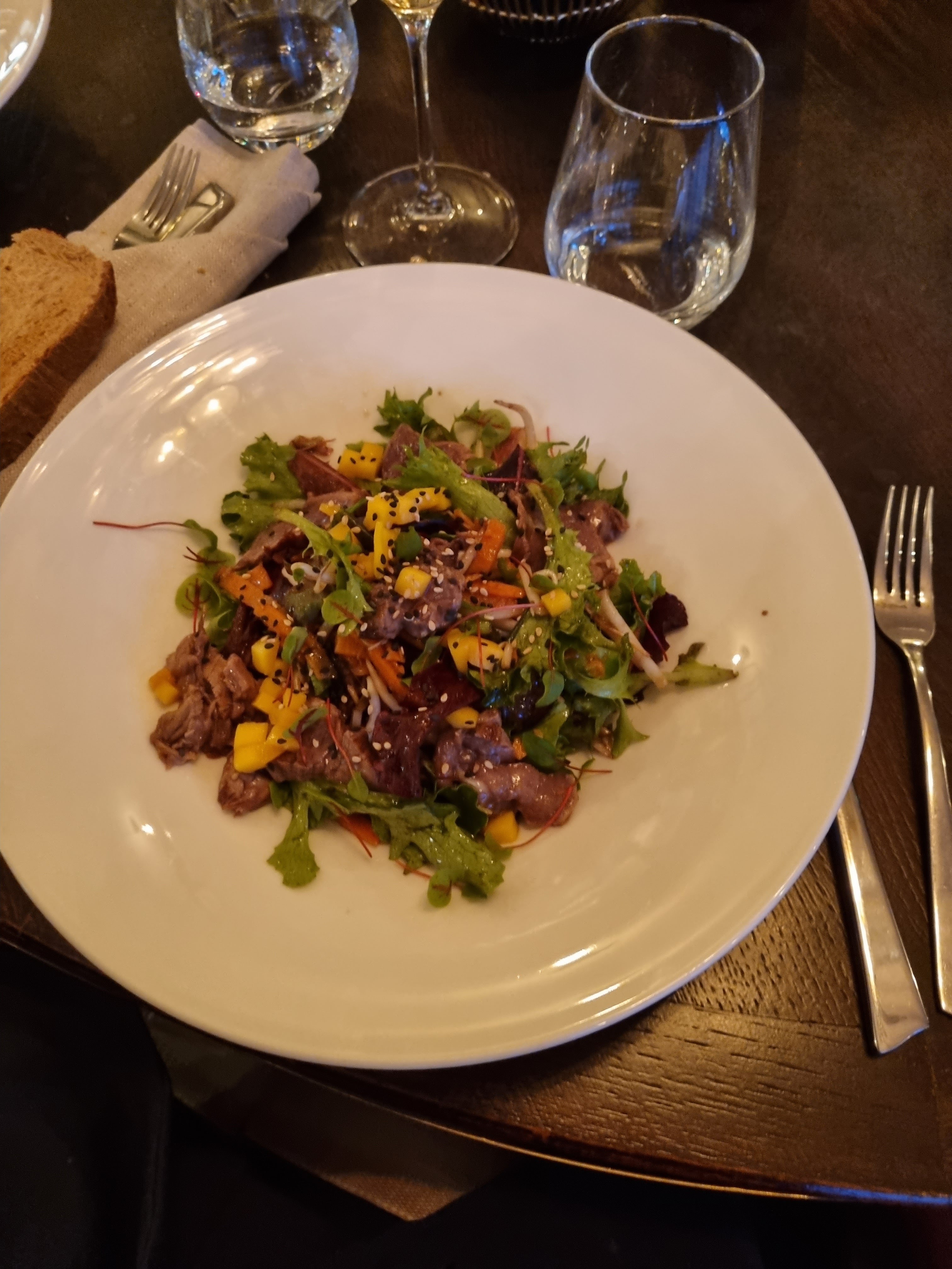 Demande de cuisson très saignant et c’était à point, dommage pour un resto de viande. Choix des vins très très banal et standard… en revanche, serveuse en apprentissage au top !