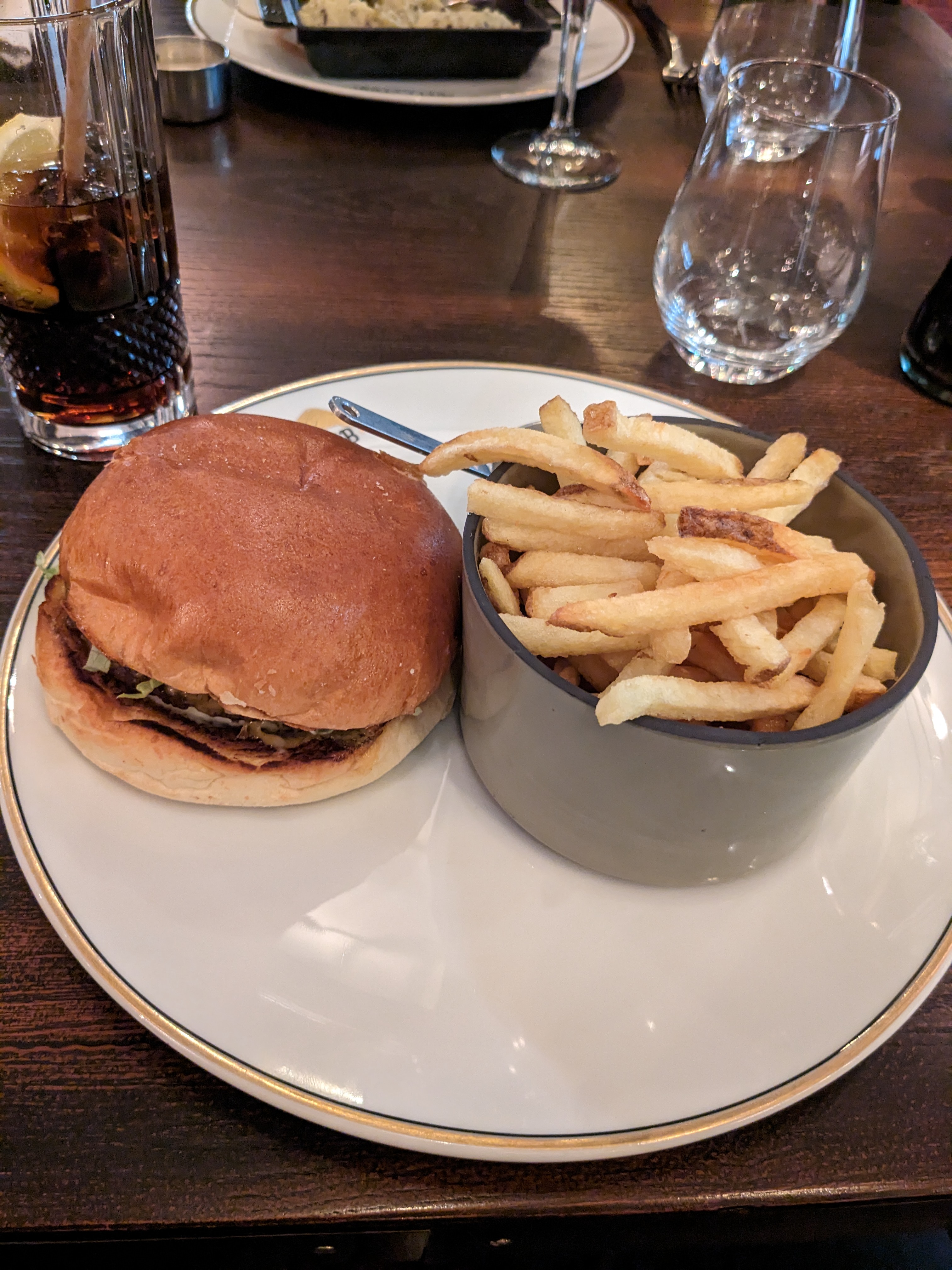 Frittes métro (soit disant « faites maison »)… Concrètement le visuel est bien présent mais la qualité n’y est pas comme sur tout le secteur ici… On achète des belles maisons à 1Million d’euros mais avec des murs en carton. Je déconseille fortement. En revanche le service est bien présent, les employés sont adorables. Mais lorsque l’on paye chère, on s’attend quand même à de la qualité. Lorsque je regarde les commentaires d’avant je me dit que soit les gens n’ont pas de palais, soit ils ne connaissent que les restaurants servis par Métro. Fuyez…
