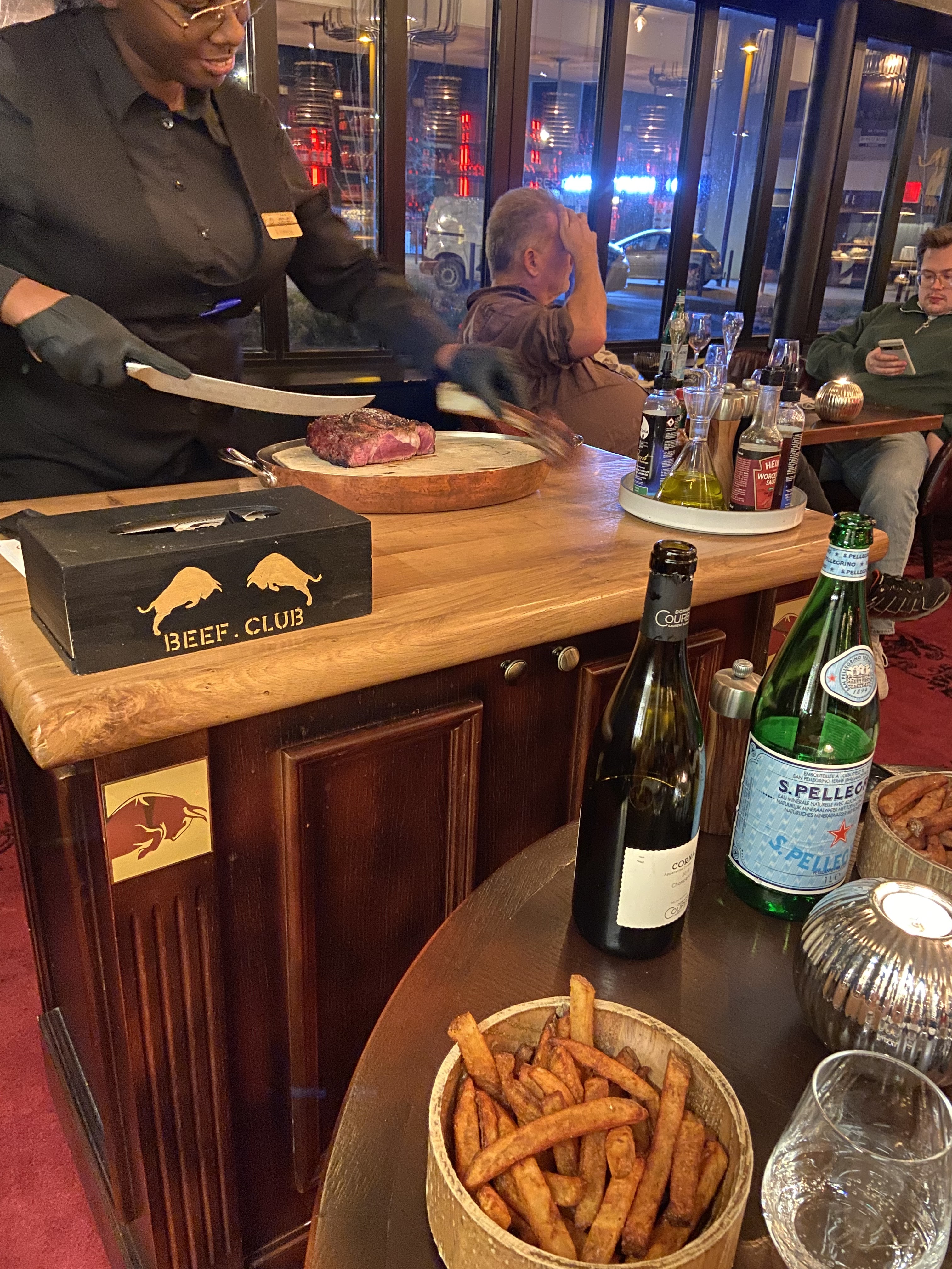 Très bon service (les serveurs et serveuses ont tous été sympathique et de bons conseils), la qualité de la viande est au rendez-vous. Idem pour les accompagnements notamment en ce qui concerne les frites à la graisse de bœuf qui sont succulentes ! En terme de vin, il y a bon nombre de grand cru à choisir. Par contre, je mets un petit bémol sur le bar en bas (le Gatsi) qui était ultra bruyant au point d’être insupportable ! C’est dommage de finir sur une mauvaise note car le dîner s’était très bien déroulé !