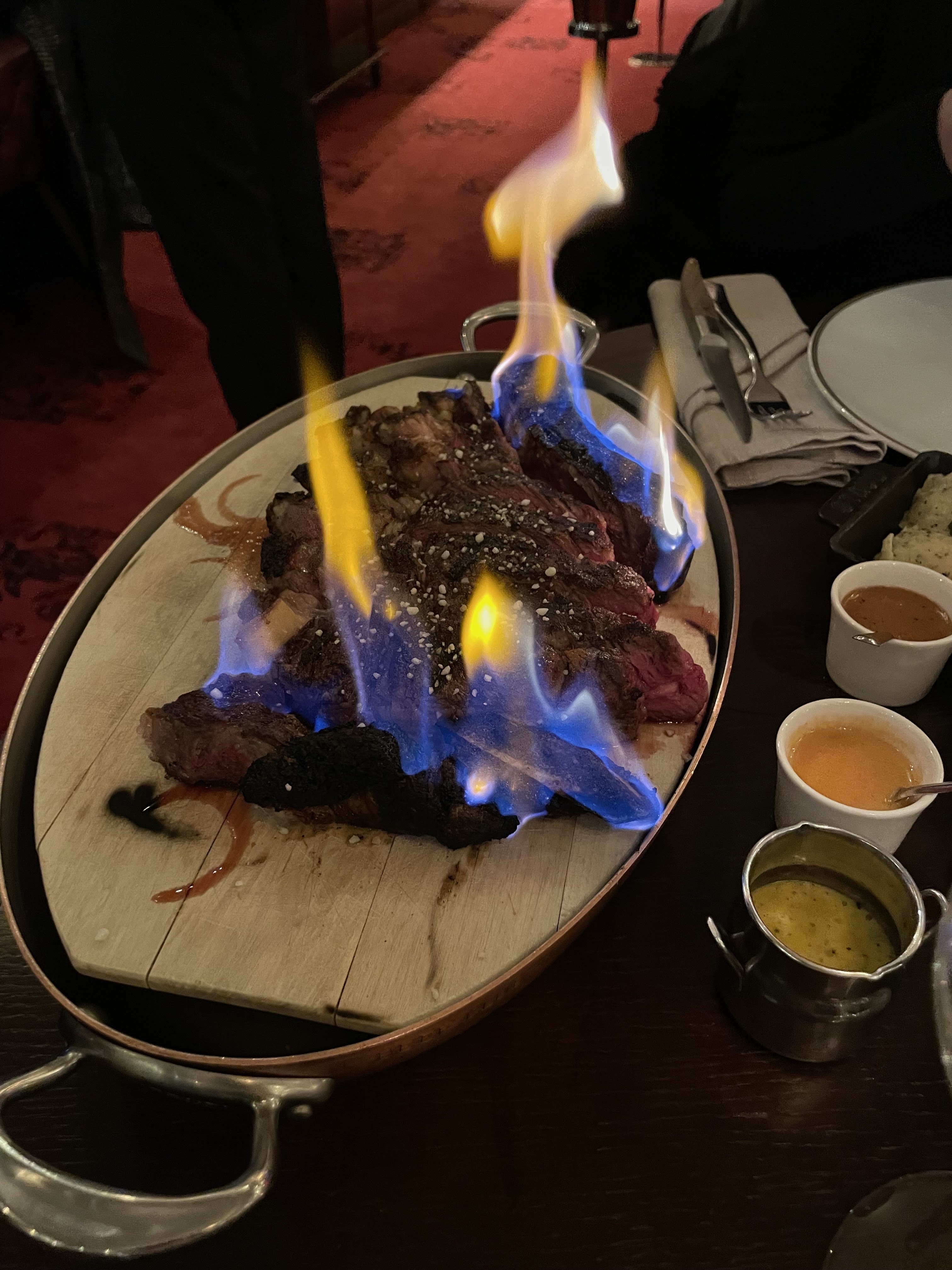 Le lieu est extraordinaire à l'intérieur, ambiance très cosy et personnel au top. Un chouille déçu des viandes maturées, le goût est très bon mais pas exceptionnel et l'assaisonnement est léger, je pinaille mais à 150 euros je pense qu'on peut :) Énorme bémol pour le bar au sous sol le Gatsby, le lieu est absolument à visiter et à profiter, c'est dingue de savoir qu'un endroit comme ça existe à côté de chez soit, aucune communication là dessus nul part! Malheureusement il est fermé maintenant :( ouvrez le et faites de la com !