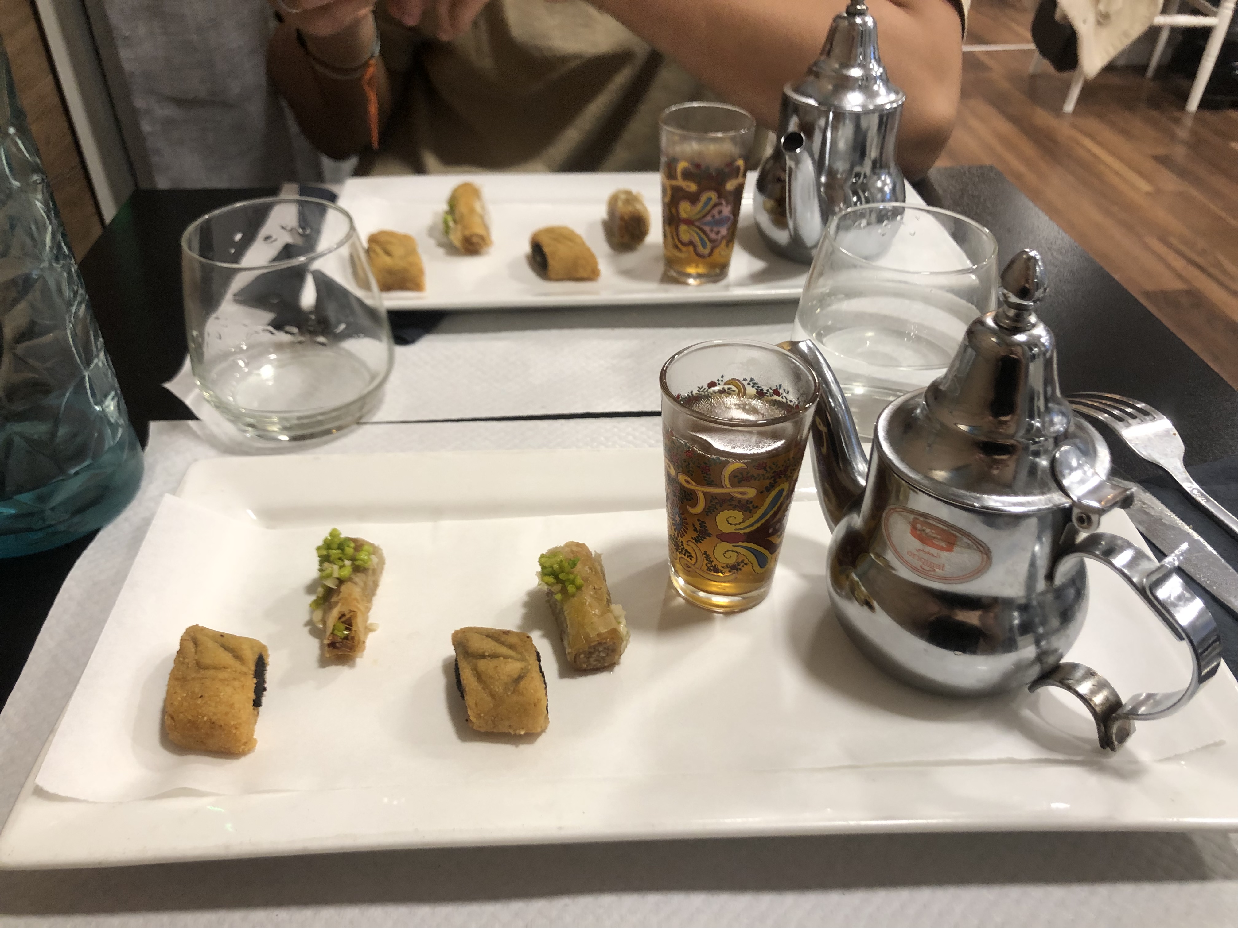 Tajine de poulet et Tajine de veau absolument délicieux. S’en est suivi un assortiment de pâtisseries orientales que l’on a gardé pour le petit-déjeuner du lendemain tellement nous avons été rassasiés. Et enfin l’incontournable thé à la menthe absolument divin. À recommander chaudement ☺️ Et