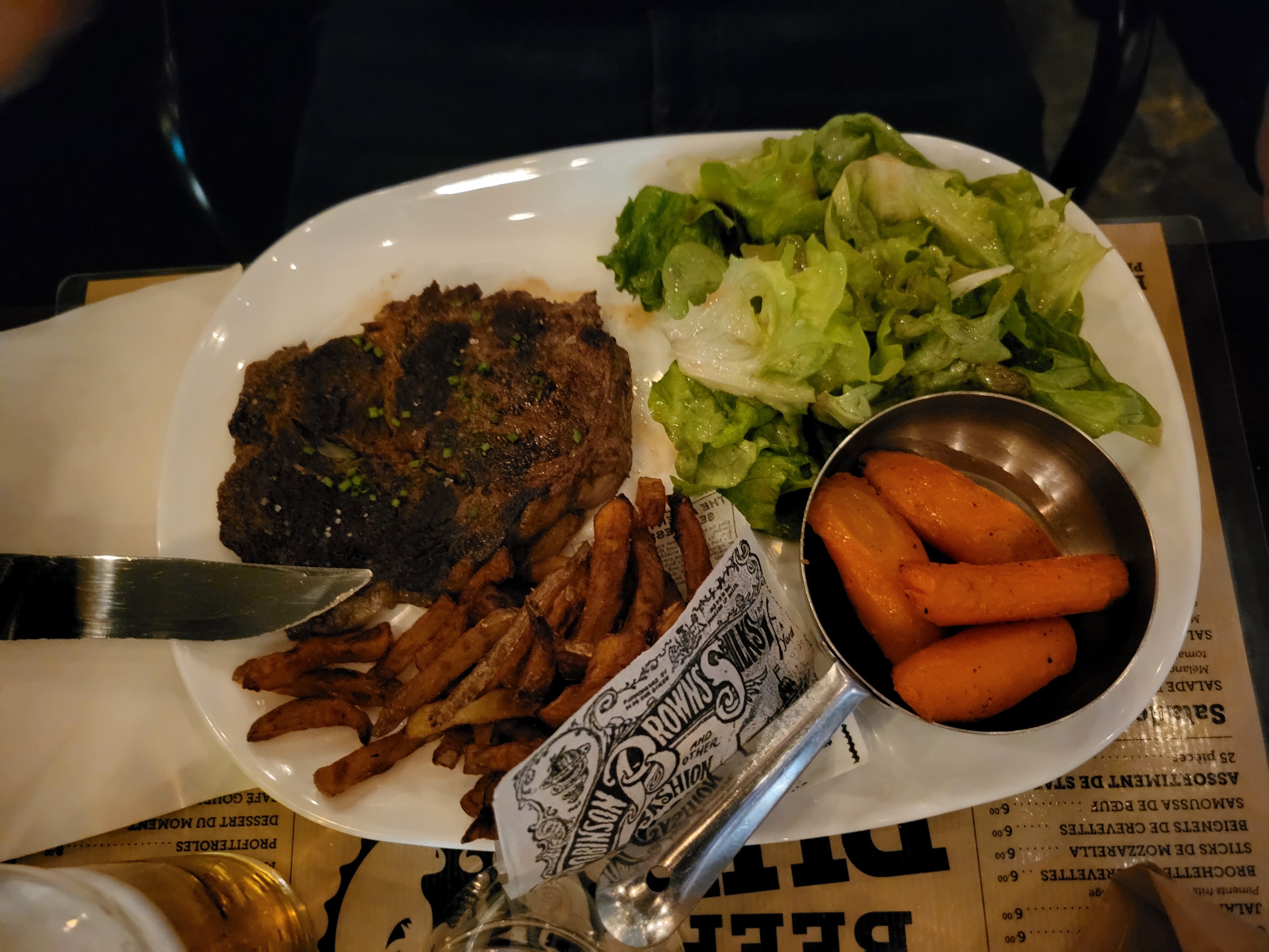 Nous nous sommes régalés bravo pour avoir respecté (c’est très très rare) la cuisson bleu de l’entrecôte : un régal, très bonne viande ainsi que les starters 🤪, burger et tartare et les accompagnements (frites trop bonnes, carottes , salade) bon conclusion 👍🏻🤤. Merci 😉
